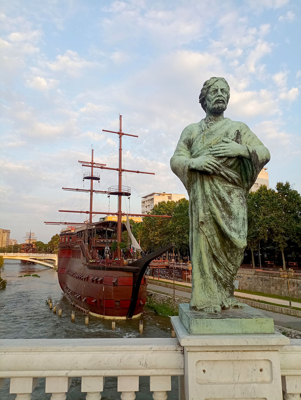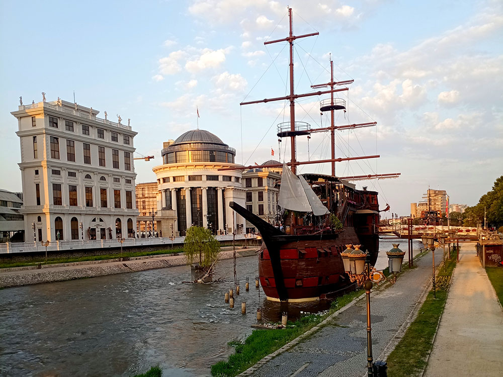 Por último, a lo lejos vemos el Puente del Arte, decorado con 14 estatuas a tamaño real de artistas y músicos de Macedonia. Desde el puente se llega a los edificios de la Ópera y el Ballet y de la Filarmónica. No nos podemos olvidar de los 3 navíos de madera que flotan en el río, curioso si pensamos que no tiene salida al mar.
