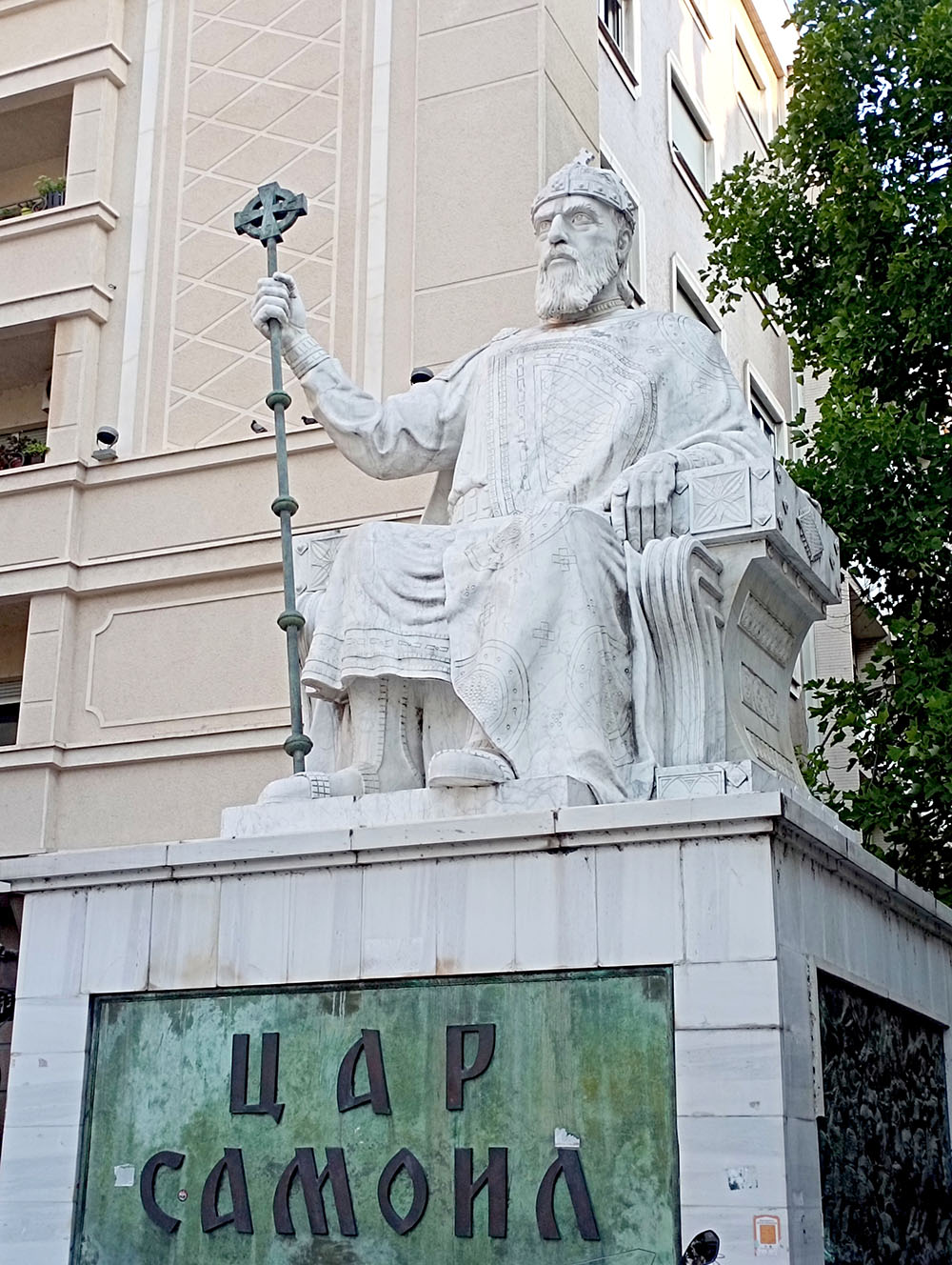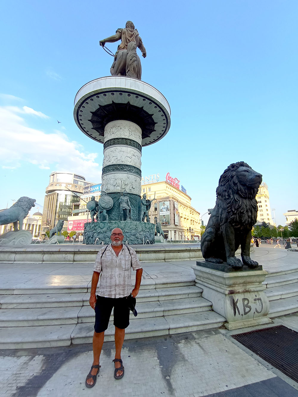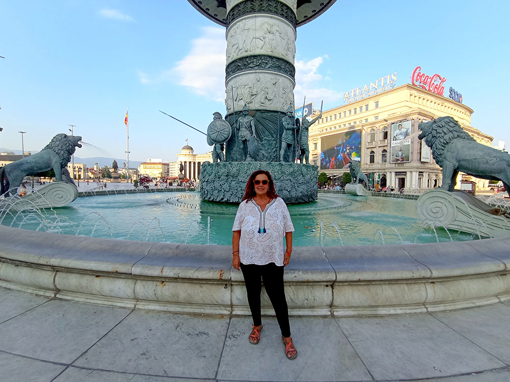 Pasado el arco triunfal llegamos a la Plaza Macedonia, es la plaza principal y la más grande de la ciudad, un lugar de reunión y celebración. En la que destaca la fuente central, coronada por una inmensa estatua ecuestre en lo más alto conocida como Guerrero a Caballo, para evitar la crítica de Grecia, ya que es obvio que se trata de Alejandro Magno.