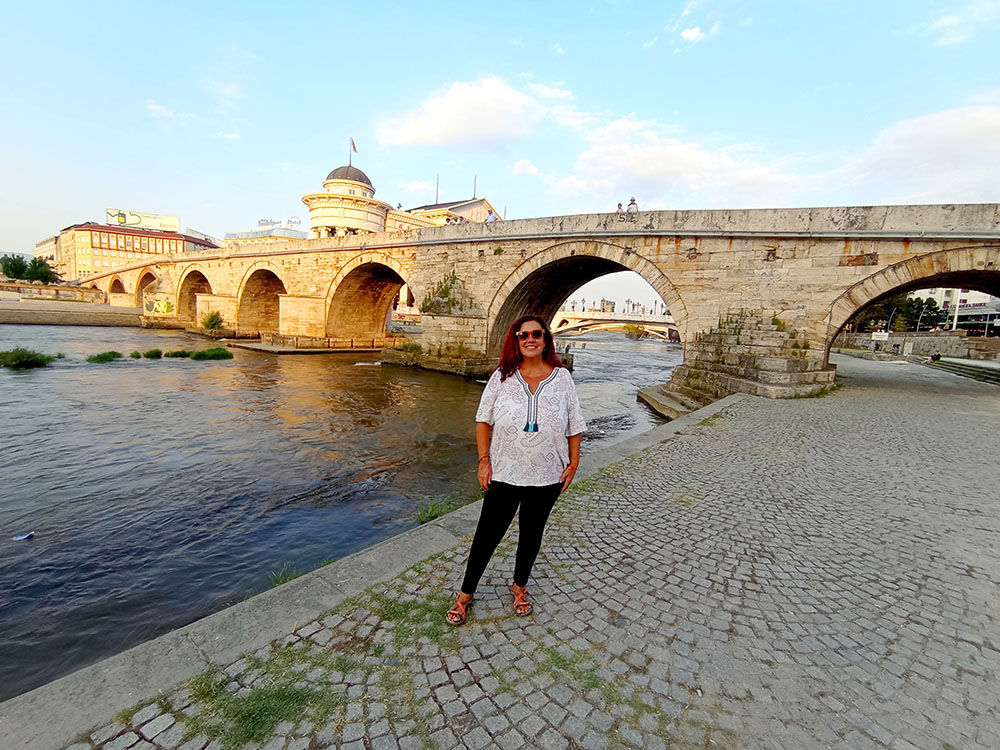 Volviendo a la Plaza de Macedonia cruzamos el río Vardar por uno de los 3 puentes que unen ambas partes. El primero de ellos es el Puente de Piedra o Kameni Most, que con sus 13 arcadas es la imagen más icónica de Skopie. Se construyó sobre un antiguo puente romano, bajo el mandato del sultán Mehmed II el Conquistador, a mediados del s. XV. En uno de sus pilares hay un curioso grupo de estatuas. Una mujer se va a lanzar al río mientras del agua sobresalen unos pies como si fuera una animación y ya alguien se hubiese zambullido. Desde la rivera se observan los edificios del Museo de la Independencia y del Teatro Nacional.