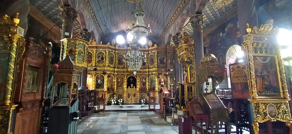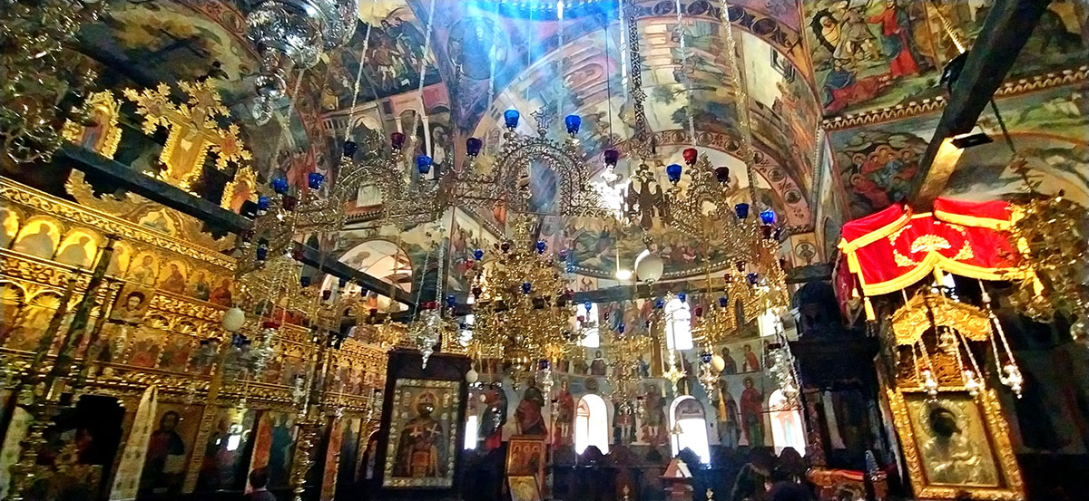 Pasada la puerta de entrada se accede al patio principal en cuyo centro se alza la iglesia de la Asunción de la Virgen, con planta en forma de cruz griega y una característica cúpula. Además de sus frescos, destaca el iconostasio dorado del s. XVII y el icono de la Virgen, de origen georgiano y datado en 1310.