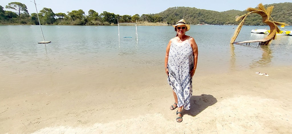 A la derecha, se encuentra la laguna, declarada reserva nacional. Hay que pagar una pequeña tasa (100 TL2024) de entrada si se quiere acceder a ella. La laguna es conocida como Blue Lagoon, por el color turquesa y aguamarina de sus tranquilas aguas. De ahí el nombre de Ölüdeniz, que significa Mar Muerto.