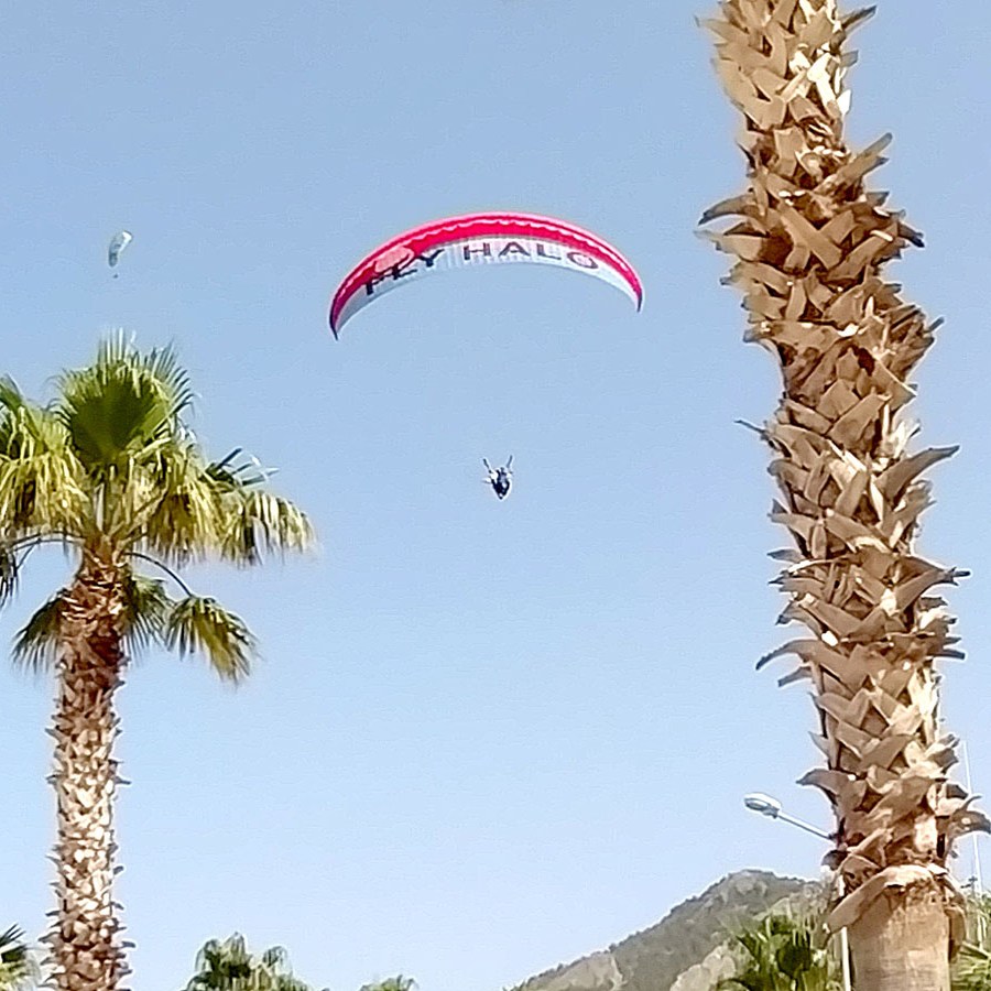 La playa de Ölüdeniz consta de dos partes. Si miramos hacia el mar, a nuestra izquierda encontraremos una larga playa de arena llamada Belcekiz. Esta larga playa es pública y en ella encontramos una zona acotada para el aterrizaje de los parapentes. Sí, porque Ölüdeniz es también conocida como el Paraíso del Parapente. El cielo se cubre de estos artefactos voladores que se lanzan desde la montaña Babadag, a casi 2.000 m de altitud, hasta aterrizar con precisión milimétrica sobre la arena. Otra zona de la playa está copada por los numerosos barcos de temática Piratas del Caribe, con la música a todo trapo, para deleite de este tipo de turismo.