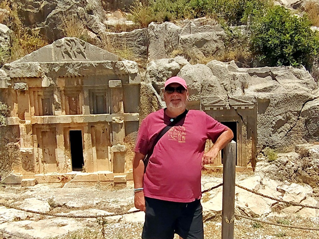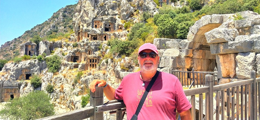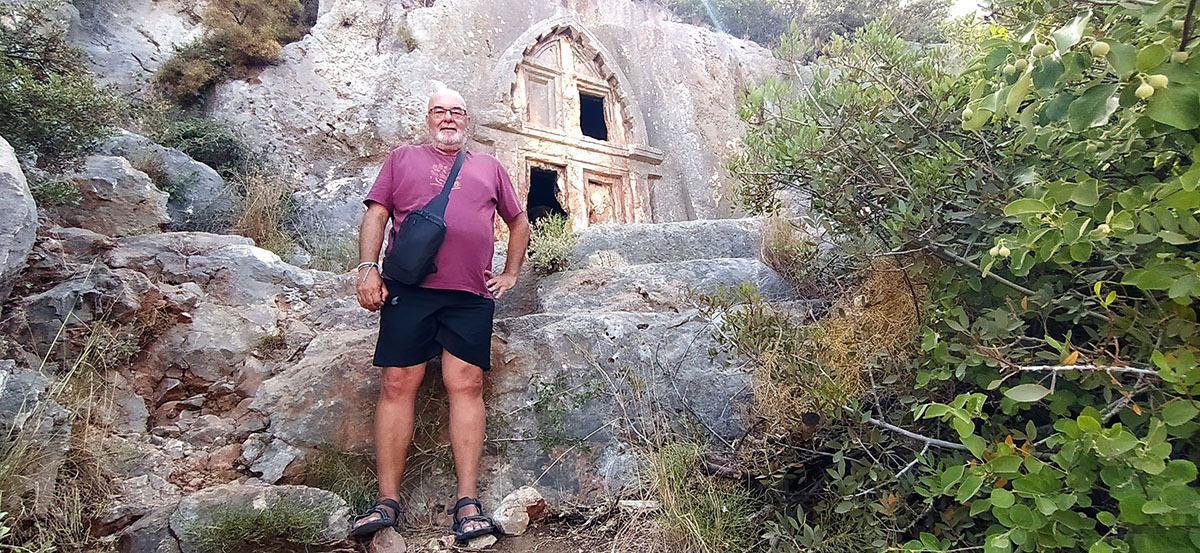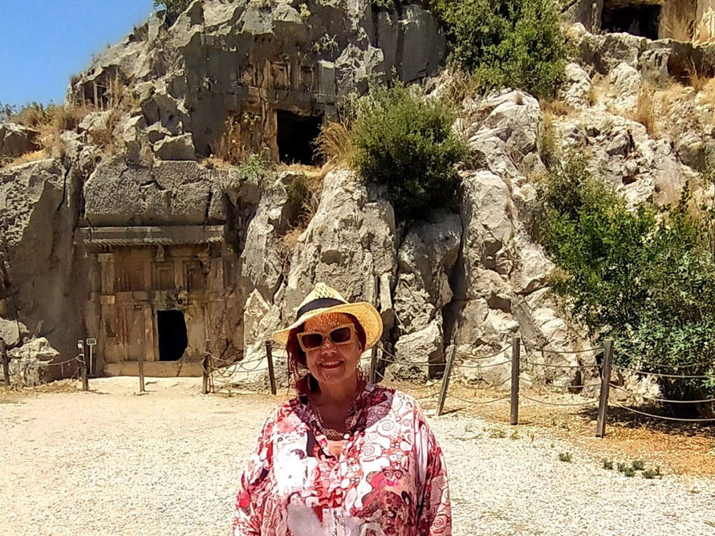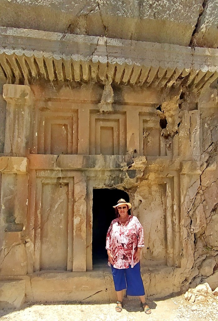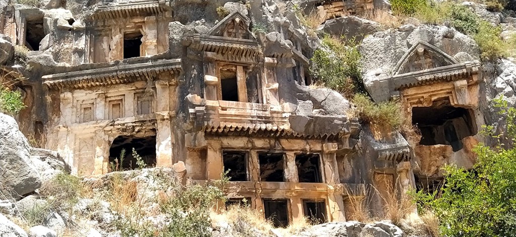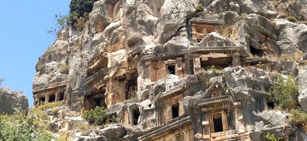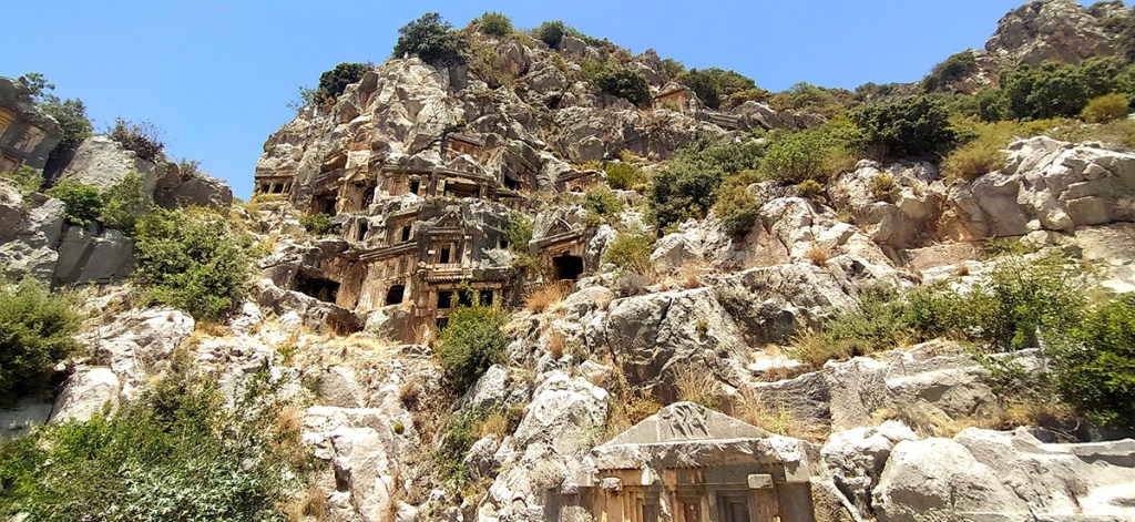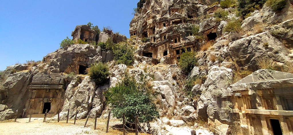 Su necrópolis, en los acantilados de las afueras, constituye su principal atractivo. Allí vimos espléndidas tumbas-templo, entre ellas la Tumba de Amintas. Construida en la ladera de la montaña alrededor del año 350 a.C., está tallada en forma de templo griego con dos columnas jónicas y dos pilares sobre la roca. El recinto estaba cerrado durante nuestra visita, pero desde la carretera se pueden ver perfectamente.