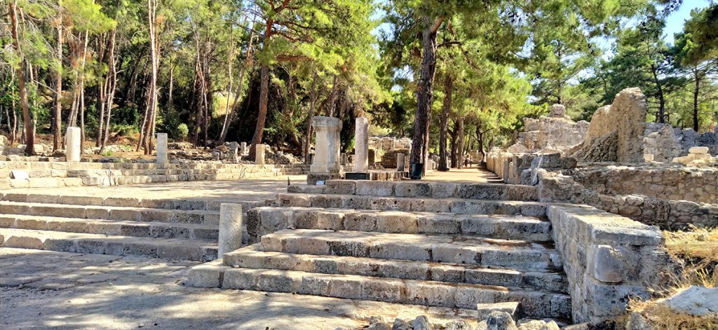 Phaselis, se extiende a los pies de los montes Tahtah Dagi, cerca de un promontorio que, adentrándose en el mar, forma tres ensenadas utilizadas en otro tiempo como puertos. Su fundación se atribuye a los rodios, originarios de Rodas, en el s. VI a.C. El yacimiento aún conserva la belleza natural del lugar. Entre un bosque de coníferas que llega hasta el mar donde se hallan esparcidos los restos arqueológicos.