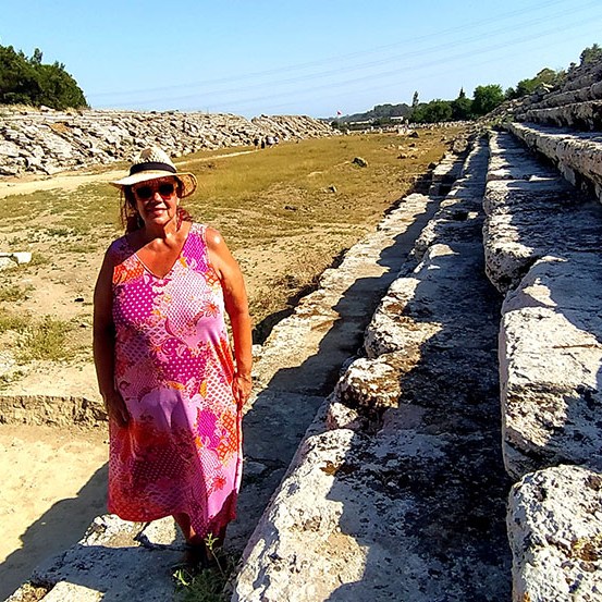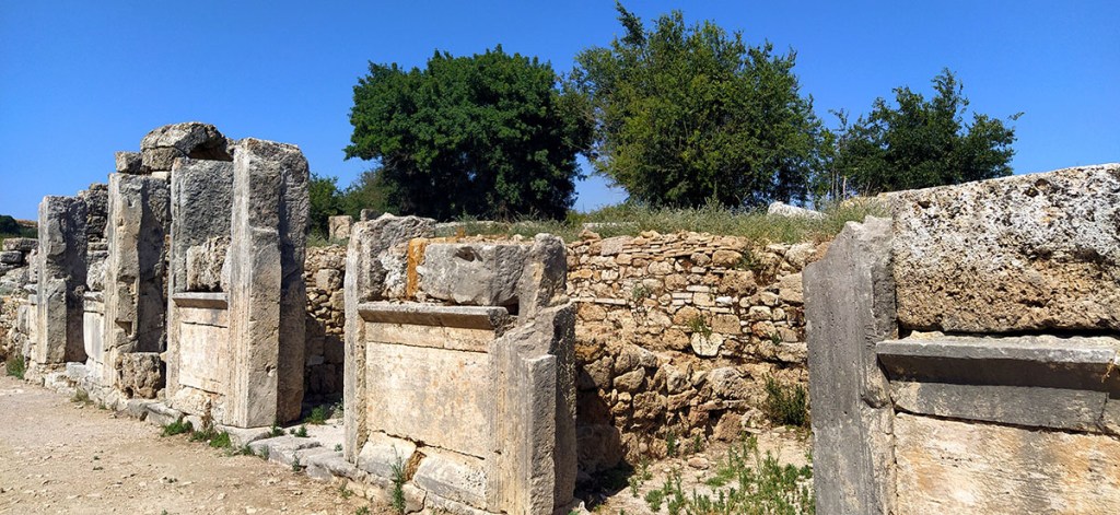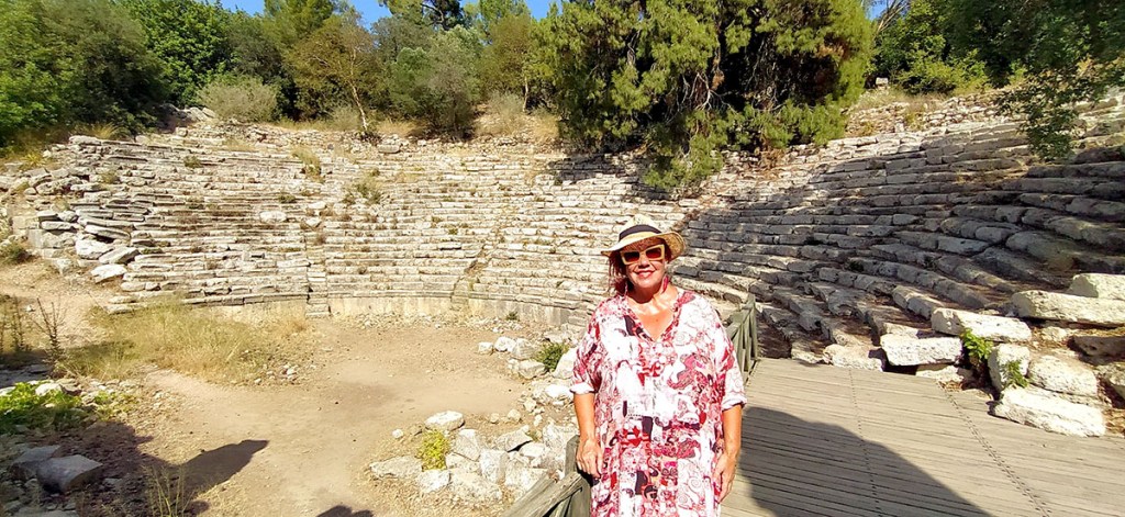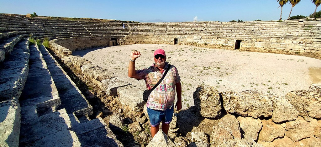 En el yacimiento hay restos de tres épocas diferentes: griega, helenística y romana. El primer edificio que vemos es el Teatro, construido por los griegos con capacidad para 12.000 espectadores, posteriormente reformado por los romanos en el s. II d.C. para los combates de gladiadores. A la derecha, el Estadio de 23 m de largo, con capacidad para albergar a 12.000 personas. Se apoyaba en pilares que formaban arcos abovedados en los que se albergaban almacenes.