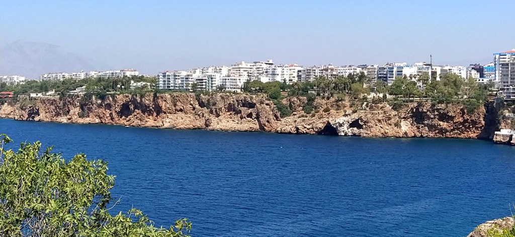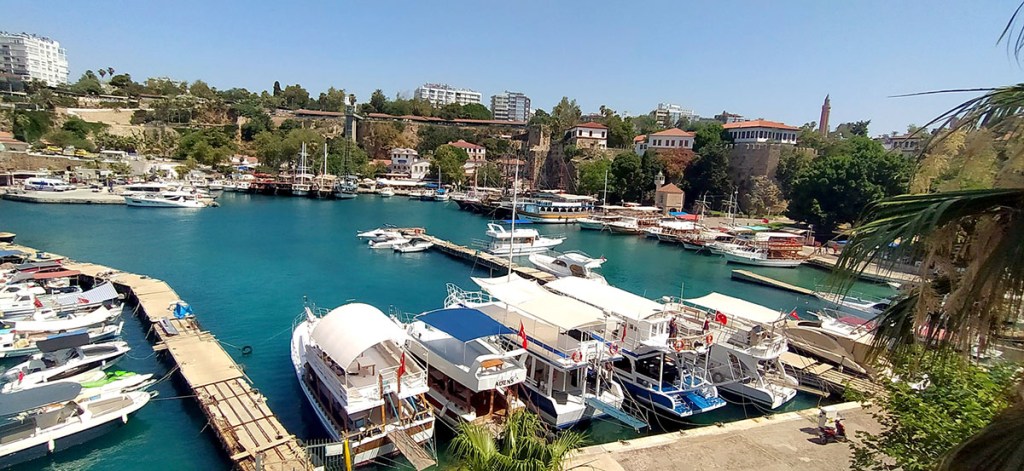 Desde el cercano parque Karaalioglu, se tienen unas espléndidas vistas del antiguo Puerto Romano, hoy puerto deportivo, rodeado de las impresionantes murallas defensivas y la pequeña mezquita hexagonal de dos pisos Iskele Camii.
