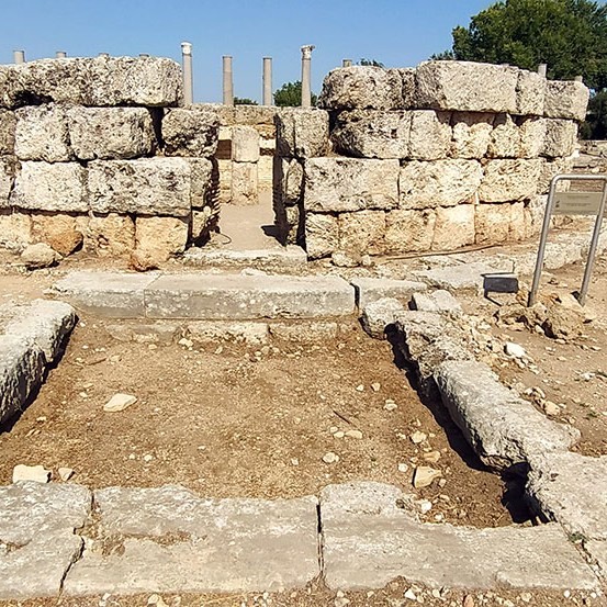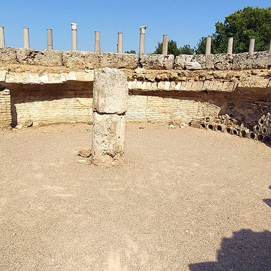 Continuamos caminando dejando a nuestra izquierda los restos de una calle con columnas, de casas, hasta alcanzar el Ágora, que incluye los restos del templo circular de Tique y Fortuna, s. II a.C., con doce columnas, en el centro.