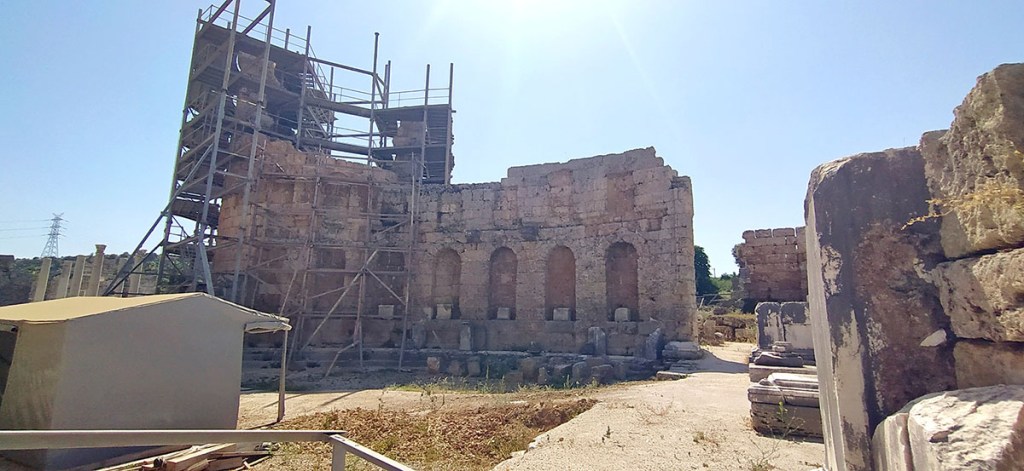 A la izquierda queda el Ágora, s. II a.C., de planta cuadrada, 75×67 m. El patio central y las tiendas estaban rodeados por una amplia stoa, una pasarela cubierta. En su interior tenía un tholos, una construcción circular con función religiosa. El ágora no solo era el centro del comercio de Perge, sino también un lugar de encuentro y un foro de debate político, social y filosófico.