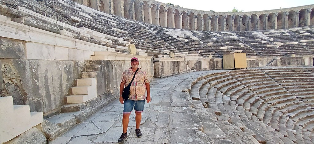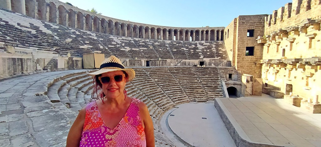 La ciudad de Aspendos en el s. V a. C. se había convertido en la ciudad más importante de Panfilia, gracias en parte al comercio de sal, aceite o vino, facilitado por su puerto fluvial. Su época de mayor esplendor se produjo entre los s. II y III d.C. Aunque poco o nada queda de la ciudad Aspendos, es conocida por tener uno de los teatros mejor conservados de la antigüedad y uno de los pocos que conserva la escena intacta.