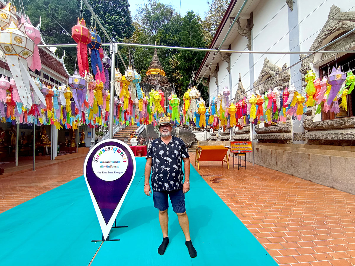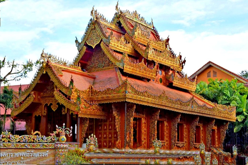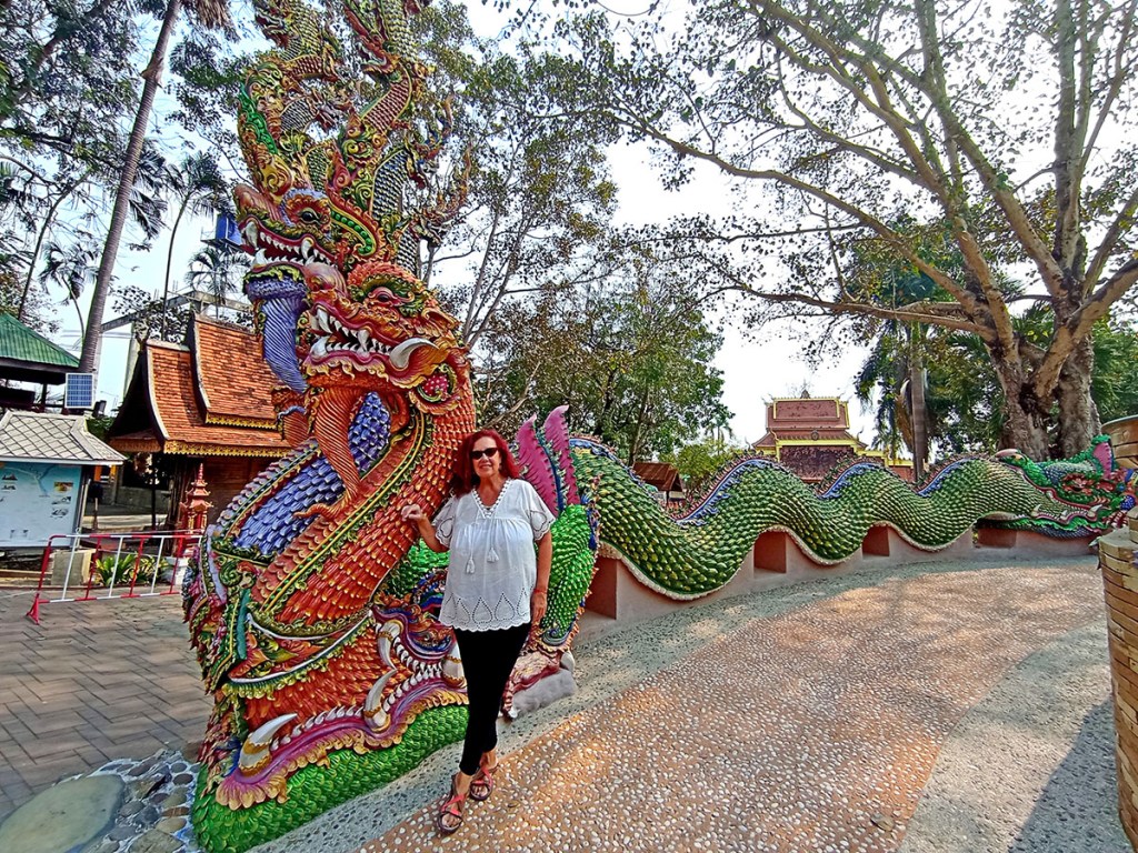 Si continuamos a lo largo de la carretera de la ribera del Mekong llegaremos hasta el lugar en que se encuentra Phra Chiang Saen Si Phaendin o Phra Buddha Nawa Lan Tue, que aparece sentado al aire libre en un gran barco llamado Rua Kaew Kusoltham, junto a otros símbolos budistas y estatuas de animales. Para un occidental parecerá una turistada, pero muchos orientales vienen hasta aquí para rendir homenaje a está magnífica imagen de Buda de bronce que refulge espectacular bajo la luz del sol.