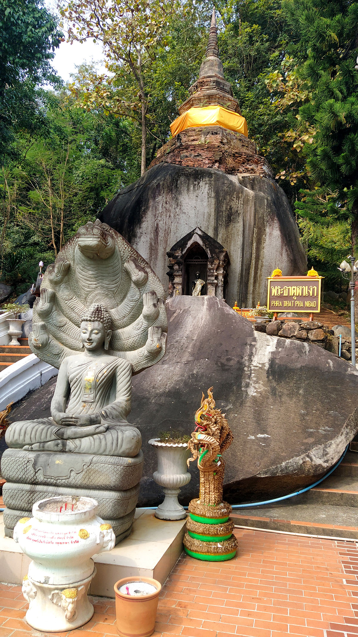 La principal atracción del templo es el Chedi de ladrillos en forma de campana que se encuentra sobre una gran roca redonda, detrás del viharn. En la roca se encuentra la pequeña imagen de Buda que la gente encontró en el bosque. Una impresionante escalera de Naga conduce hacia la cima de la colina desde donde se tienen unas vistas espectaculares.