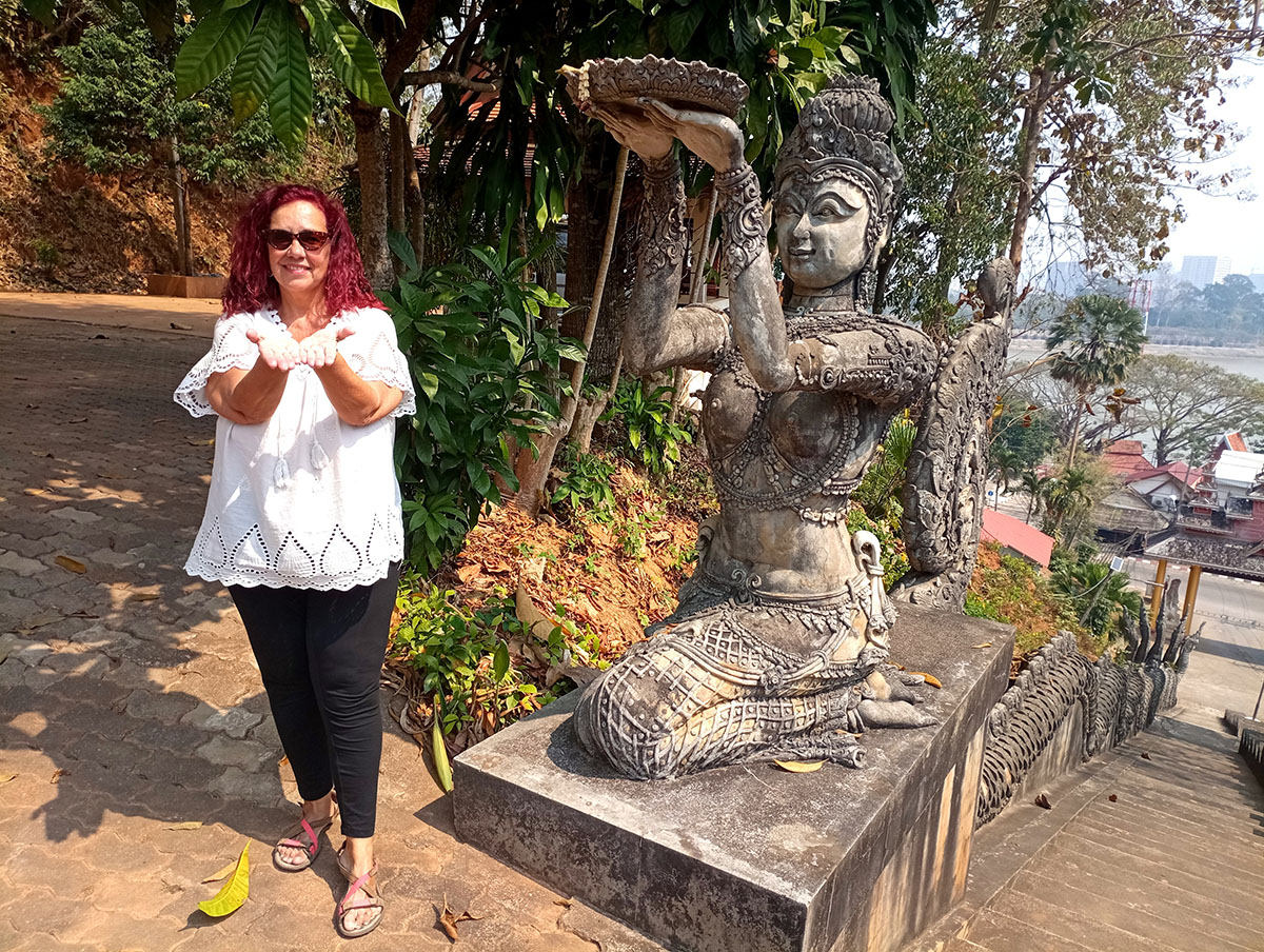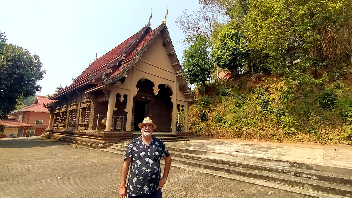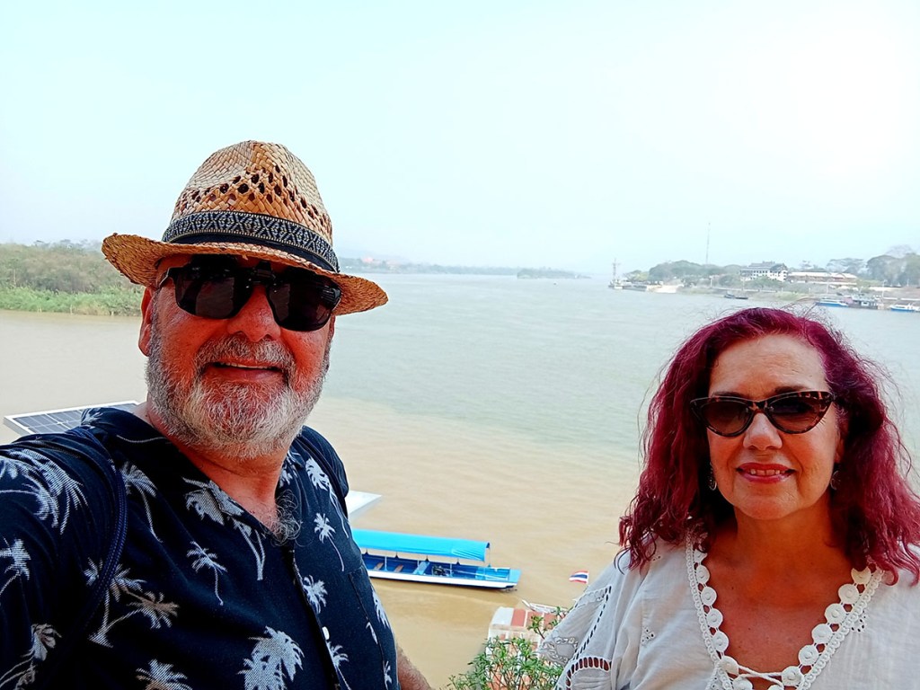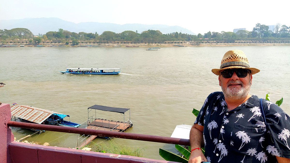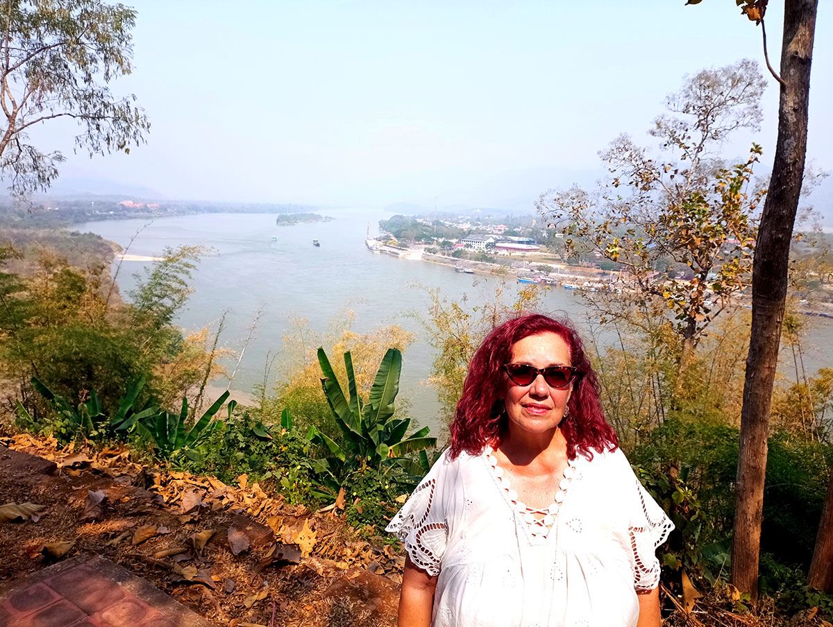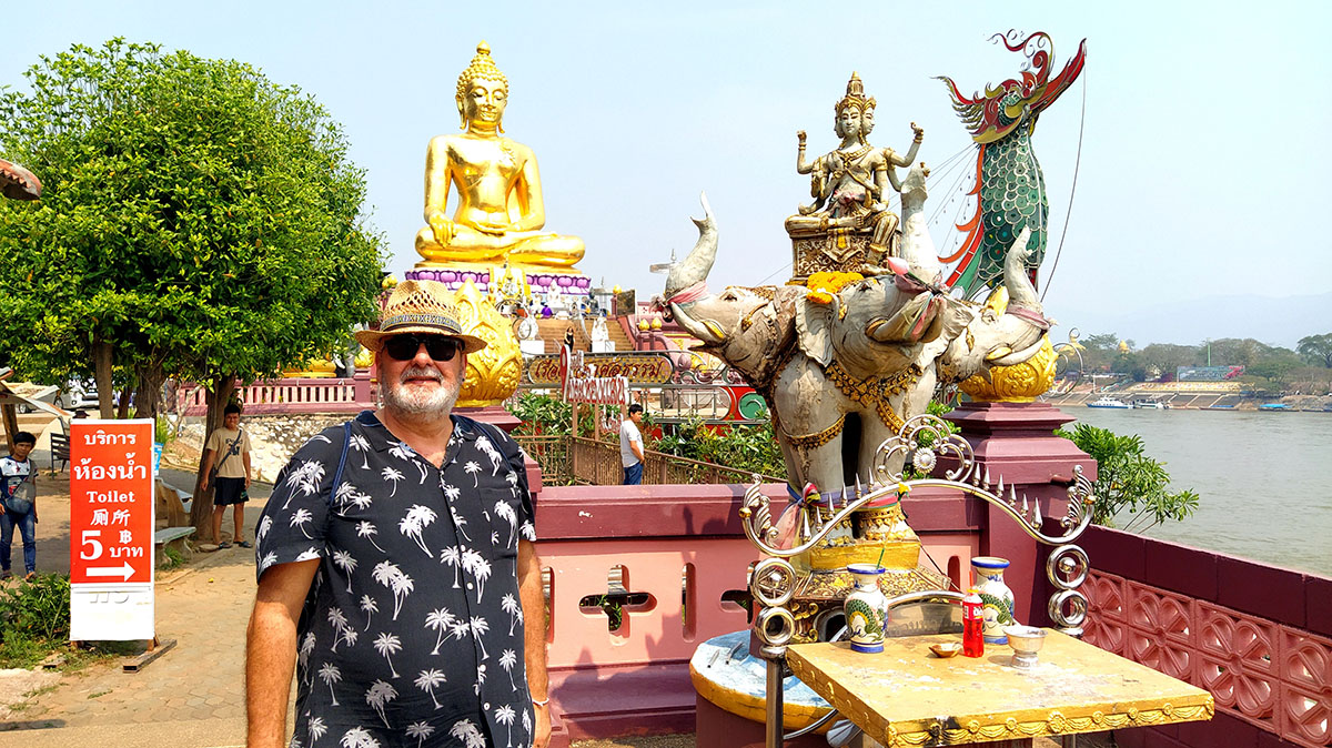 Desde el patio del templo se tienen unas vistas espectaculares sobre el punto donde convergen los ríos; Mekong de un color grisáceo y el Ruak de color más terroso. Su unión marca la frontera de los tres países Tailandia, donde nos encontramos, arriba Myanmar y en frente Laos.