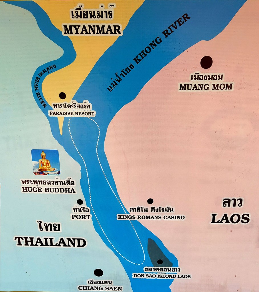 Otro de los puntos que marcan el Triángulo Dorado y que indica el encuentro geográfico de Tailandia, Laos y Myanmar es la estructura en forma de triángulo dorado que simboliza la convergencia de estas tres naciones. También se ofrecen viajes en barco por el río Mekong con paseos por el río y visita al mercado de Don Sao en Laos. Nosotros no lo hicimos porque pensábamos viajar a Laos y navegar por el río Mekong.
