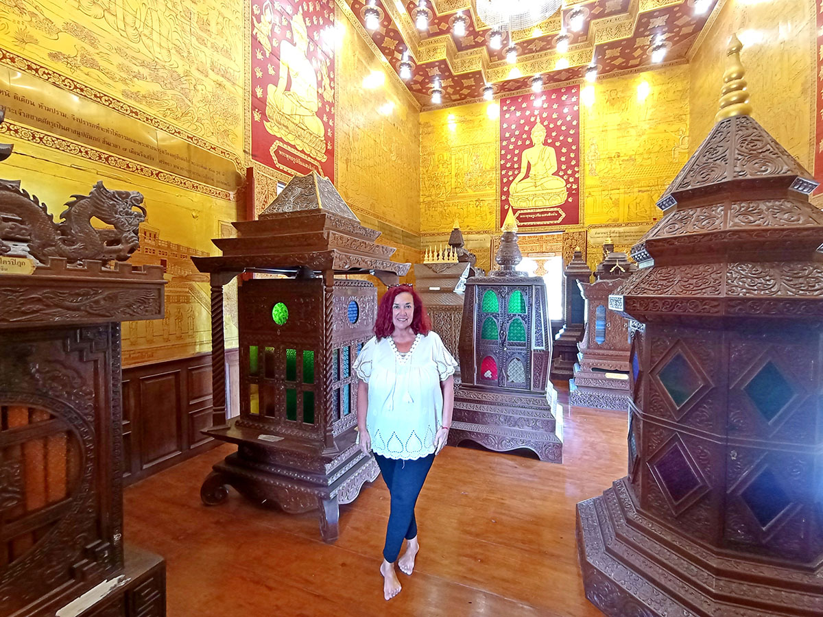 El primer edificio que te recibe es el Salón Tripitaka, dispuesto en medio de un estanque con peces. Es un hŏr đrai o depósito de manuscritos de teca dorada. En su interior se guardan las tripitaka, las escrituras budistas. Distribuíos en bellos archivadores labrados organizados por países; Tailandia, Laos, India, Camboya, etc…Las paredes están decoradas con imágenes de templos del norte de Tailandia.