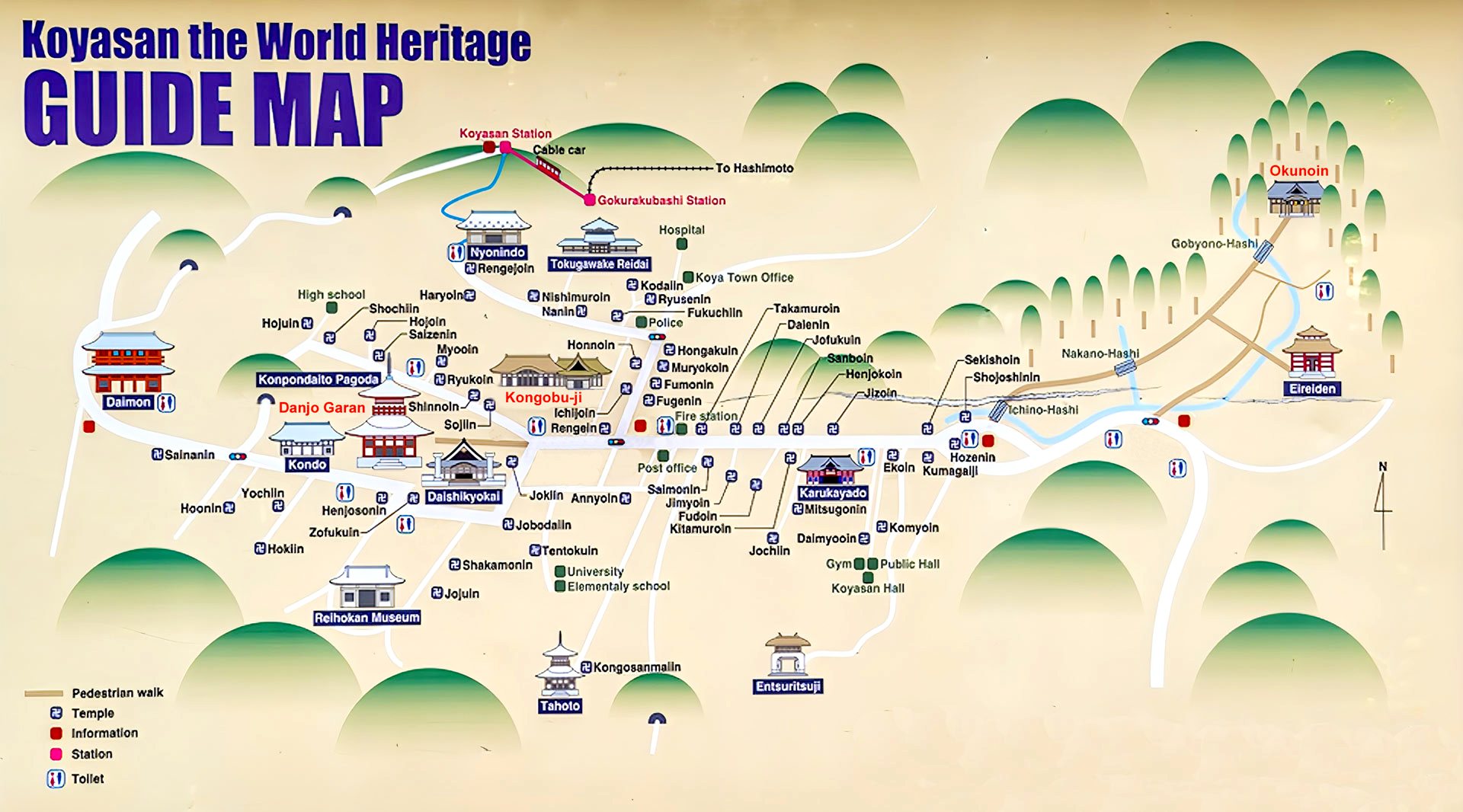 En el recinto podemos encontrar más de 20 edificaciones pero las más interesantes son: el Kondo, la sala principal donde Kukai enseñaba y realizaba ceremonias, el Mieido, su residencia, donde recitaba sutras a diario, el Konpon Daito, la primera torre de estilo Tahoto en Japón, que simboliza el budismo Shingon o el estanque de loto Haisuke.