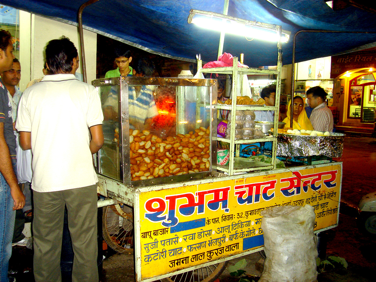 Por la noche dimos un paseo por el Bazar Bapu de la ciudad vieja. Aquí se puede disfrutar de la mejor comida callejera, desde los deliciosos aperitivos y dulces de Rajastán, pasando por los kachoris, pasteles fritos, a menudo salados y rellenos de cebolla o lentejas o los mirchi wadas, buñuelos de chile finalizando con dulces locales. Es una excelente manera de experimentar los sabores de Udaipur.