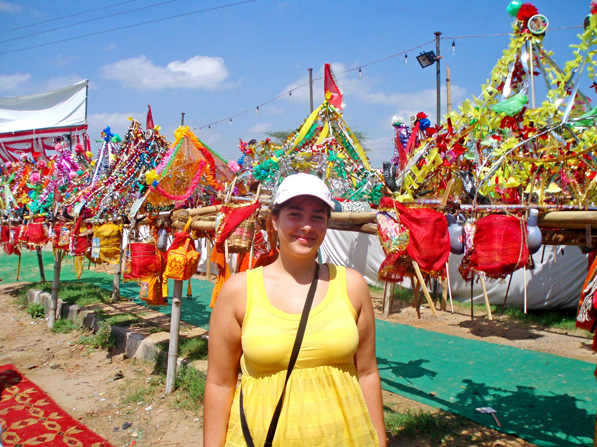 Nos llamó mucho la atención ver por la carretera caminando a peregrinos que portaban estructuras, elaboradas con papel o materiales ligeros, decoradas con colores vibrantes, espejos o lentejuelas. Pasamos por pueblos en cuyas calles de tierra deambulaban vacas y curiosamente sobre las guaguas viajaban personas. El paisaje poco a poco cambiaba a medida que nos adentrábamos en la zona del Rajastán, haciéndose más y más desértico.