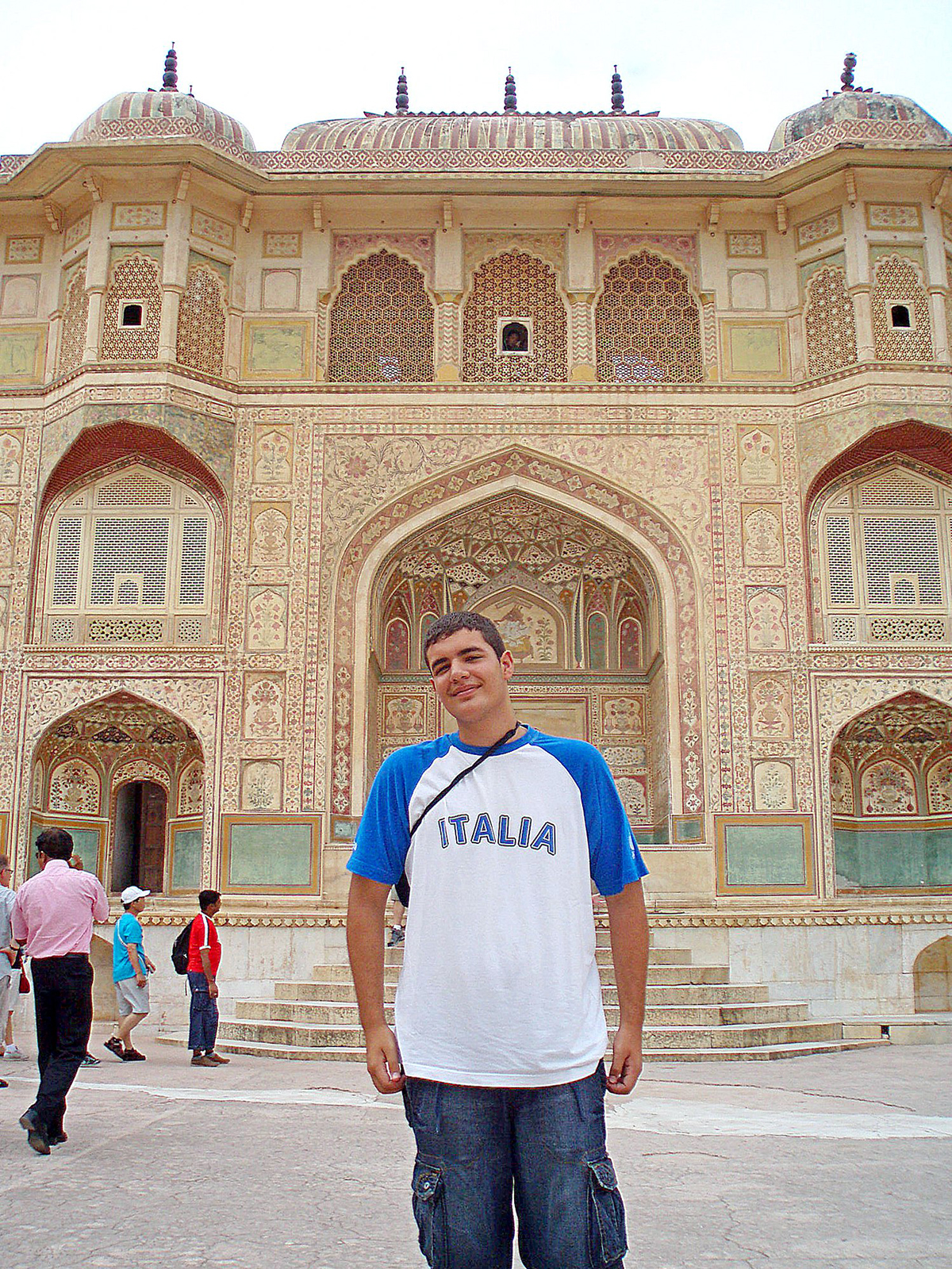 Nuestra primera parada fue en el Palacio de Jaipur, oficialmente conocido como el Palacio de la Ciudad, fue el punto central de la ciudad ya que ésta se desarrolló de forma radial. Es un vasto complejo de palacios, patios, jardines y edificios, que sigue siendo la residencia de la familia real de Jaipur, aunque gran parte de él está abierto al público como un museo. fue construido por Maharajá Sawai Jai Singh II, entre los años 1729 y 1732. Accedimos por la Nakkarkhana Pol o Puerta de la Casa de los Tambores, en referencia a la sala o plataforma donde se tocaban los tambores, nakkar y las trompetas para anunciar la llegada o la partida del maharajá. Es la entrada del primer gran patio del palacio, el Jaleb Chowk