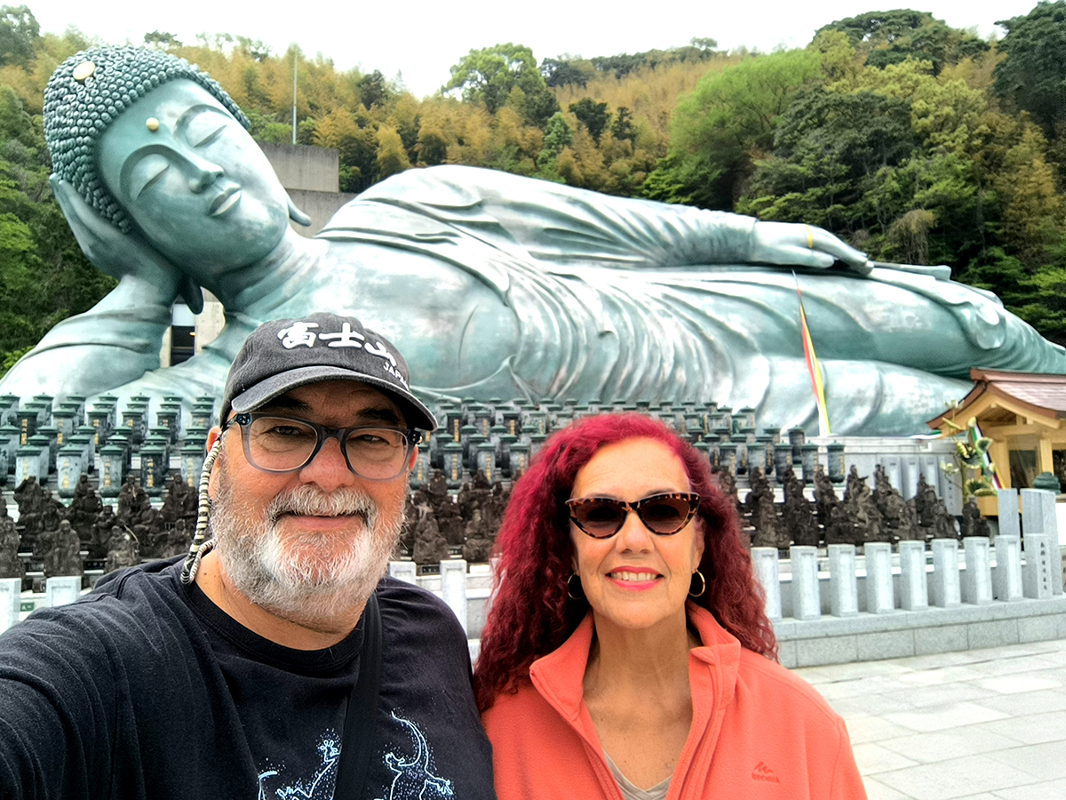 Cruzamos un túnel que conecta con el camino al Buda gigante que está decorado con estatuas budistas y cientos de pequeños jizō, los guardianes de los niños. Es un paseo lleno de espiritualidad que merece hacerse con calma. No pasan desapercibidas las grullas de origami colgadas en cuerdas y guirnaldas, a menudo cerca de las estatuas o en lugares de oración. Son ofrendas hechas por los visitantes. Al igual que los tablones de deseos, Ema o las cuerdas anudadas Omikuji, las grullas representan los anhelos, plegarias y buenos deseos de los fieles.