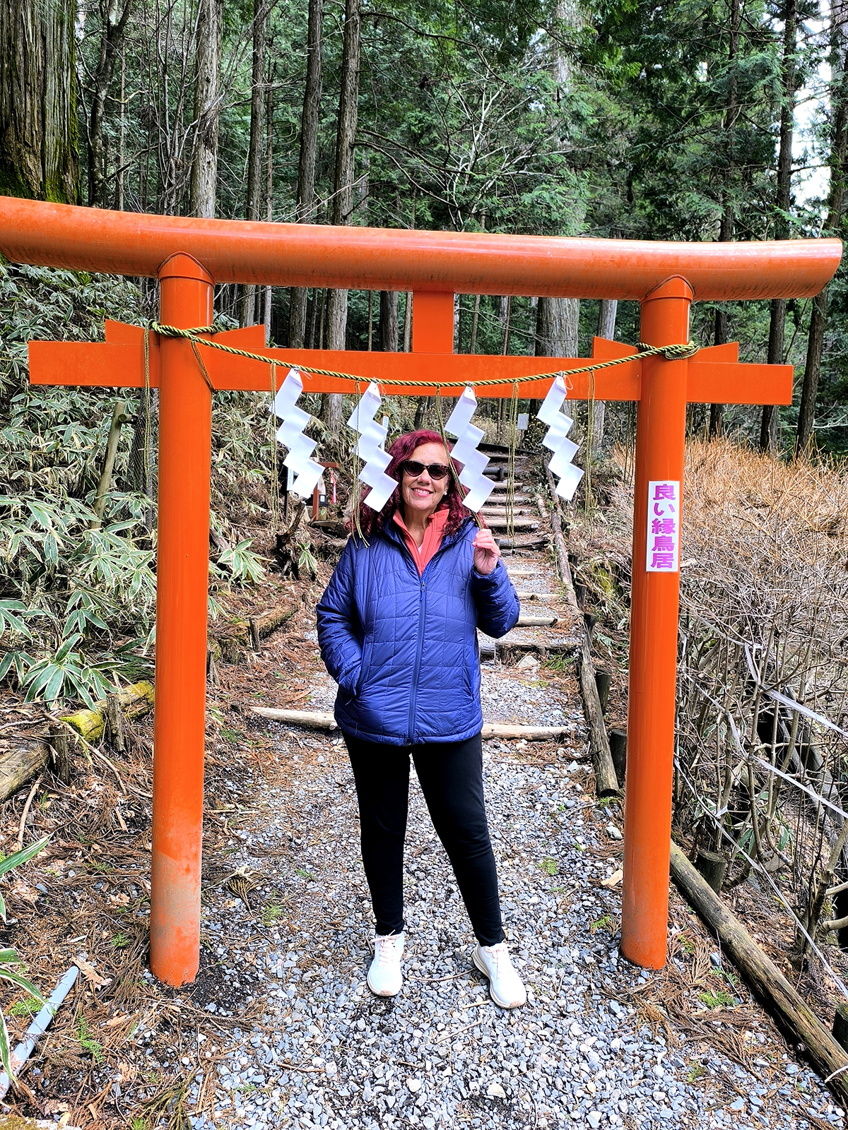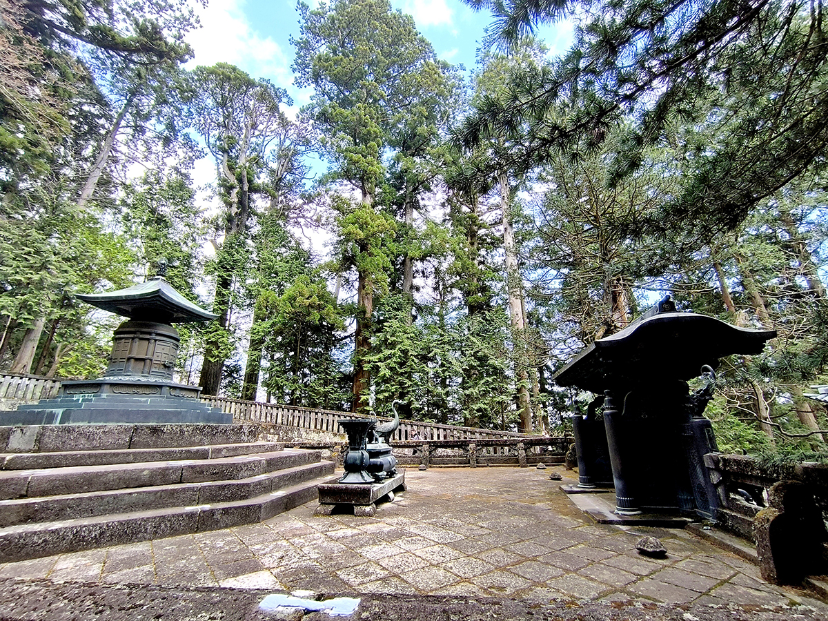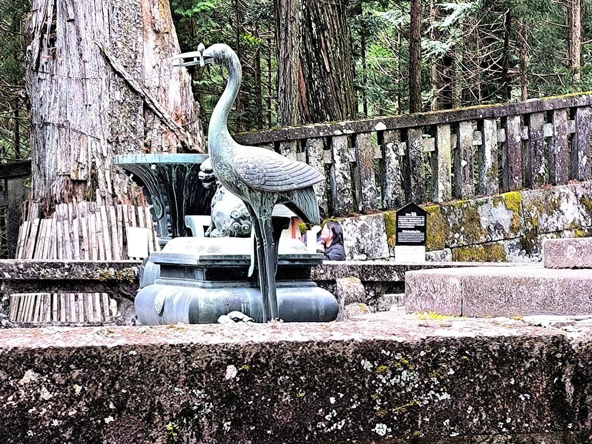 Continuamos hacia la entrada que conduce al área de la tumba, primero encontramos la pequeña y famosa talla del Gato Durmiente, Nemurineko e inmediatamente la puerta Sakashitamon, la última entrada ceremonial. Un largo tramo de escalones empinados lleva, después de cruzar un camino boscoso, al Okumiya Haiden, un pequeño salón de adoración de madera que sirve como el último punto ceremonial antes de la tumba. Un pequeño camino de piedra lleva hasta el mausoleo final, Okumiya Hōtō, una sencilla urna de bronce, Hōtō donde reposan los restos y cenizas del shogun, Tokugawa Ieyasu. Delante de la urna de bronce se encuentra una estatua simbólica que representa una grulla apoyando sus pies sobre una tortuga, que representa la longevidad y la eternidad. Aquí solo subió Rosi, yo estaba derrengado, jajaja, ¡ella diría que soy un flojo!