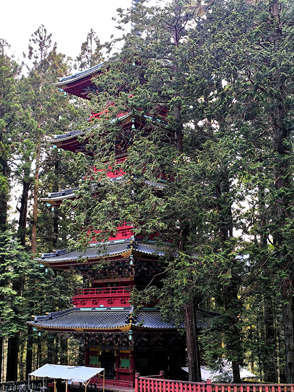 El recorrido por el santuario Tōshō-gū es un ascenso ceremonial a través de puertas y patios, diseñado para mostrar progresivamente más esplendor hasta llegar al mausoleo final. El camino comienza con un gran Torii de piedra, Ishidorii, construido en el año 1618, flanqueado de grandes árboles que se abren a una esplanada donde se eleva una Pagoda de Cinco Pisos, Gojūnotō que destaca no solo por su altura, 35 m, y sus vibrantes colores, sino también por el complejo diseño de su pilar central flotante, una técnica japonesa antigua utilizada para absorber los movimientos sísmicos.