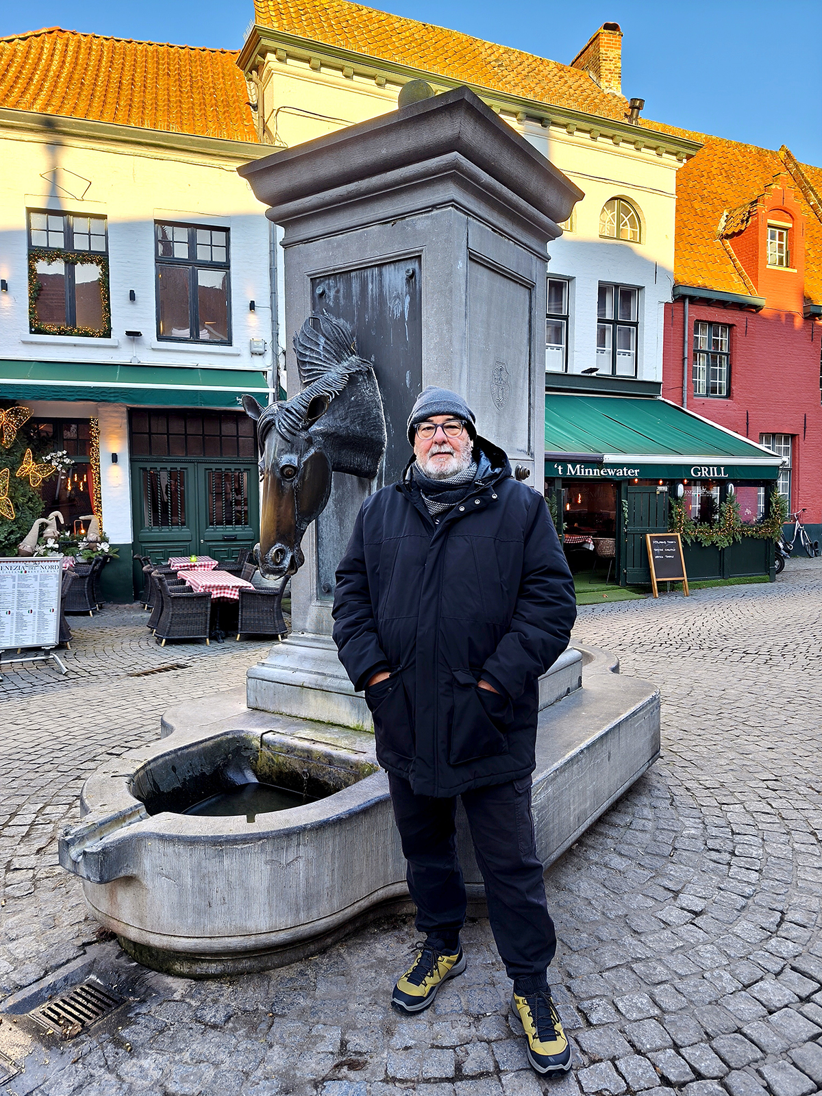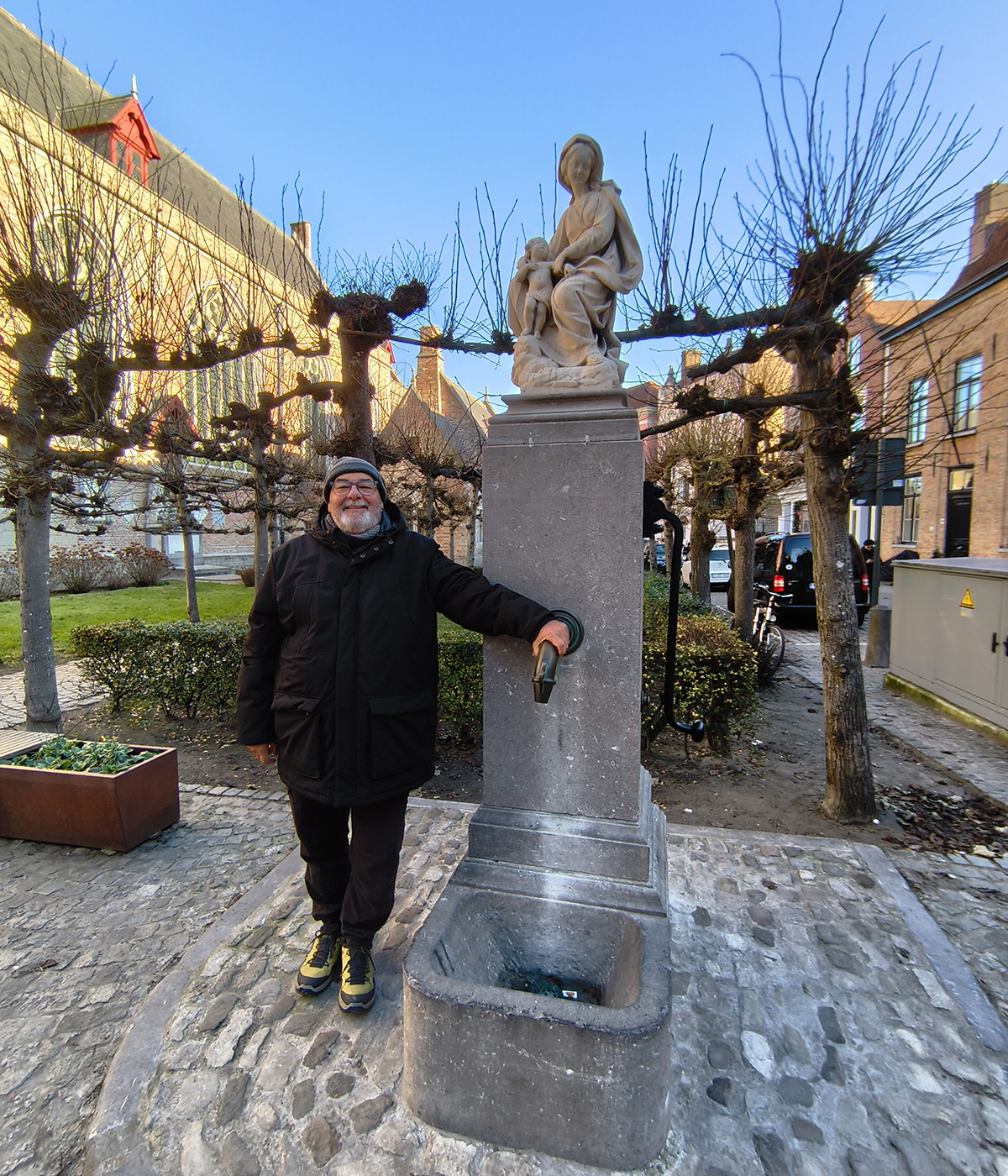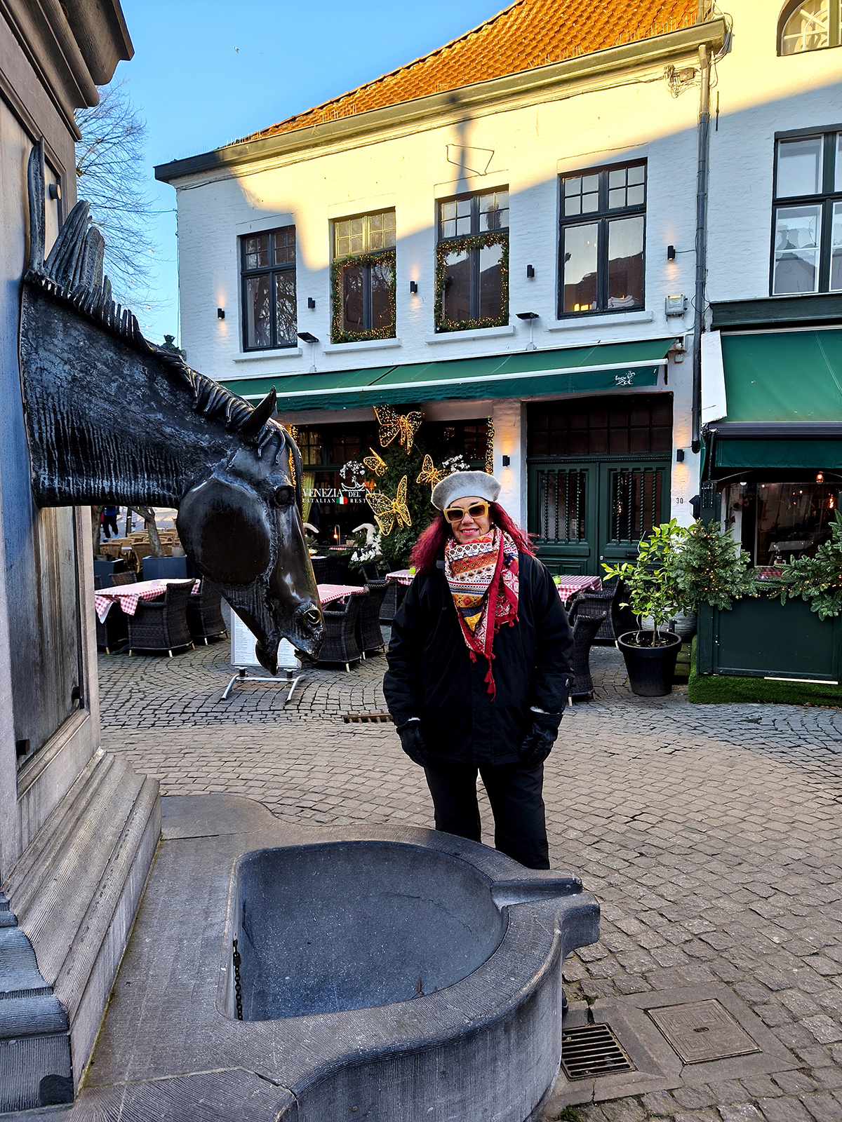 Al salir del beaterio por su preciosa puerta principal cruzaremos los canales por un puente de piedra, Begijnhofbrug que da a un edificio que en su fachada muestra la figura de una monja con rasgos muy masculinos. Es una sátira que hace referencia humorística a la idea de un hombre intentando «colarse» en o espiar el Beaterio, ya que tenían prohibido su entrada. Unos metros más adelante encontramos la Paardendrinkplaats, el Bebedero de Caballos, históricamente, este era el lugar donde los caballos que transportaban mercancías y personas descansaban y bebían antes de entrar o salir de la ciudad por la zona sur. Hoy en día, sigue siendo el lugar donde los carruajes turísticos, koetsen, hacen su parada oficial para que los caballos beban agua y descansen a la sombra de los árboles de la plaza.