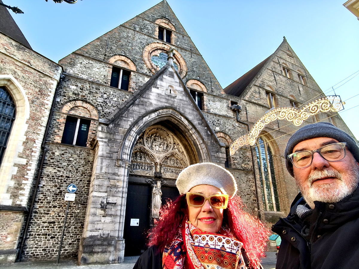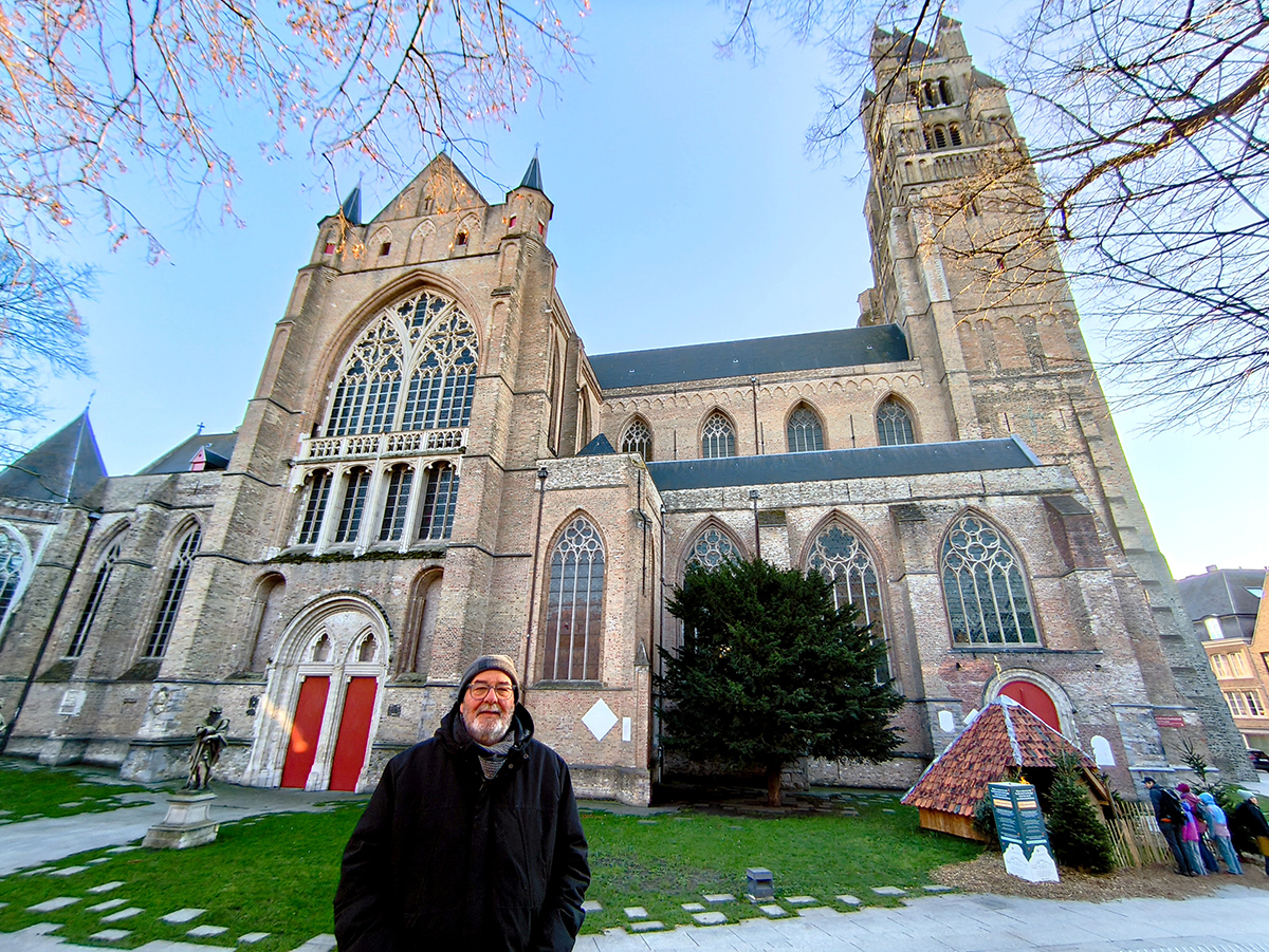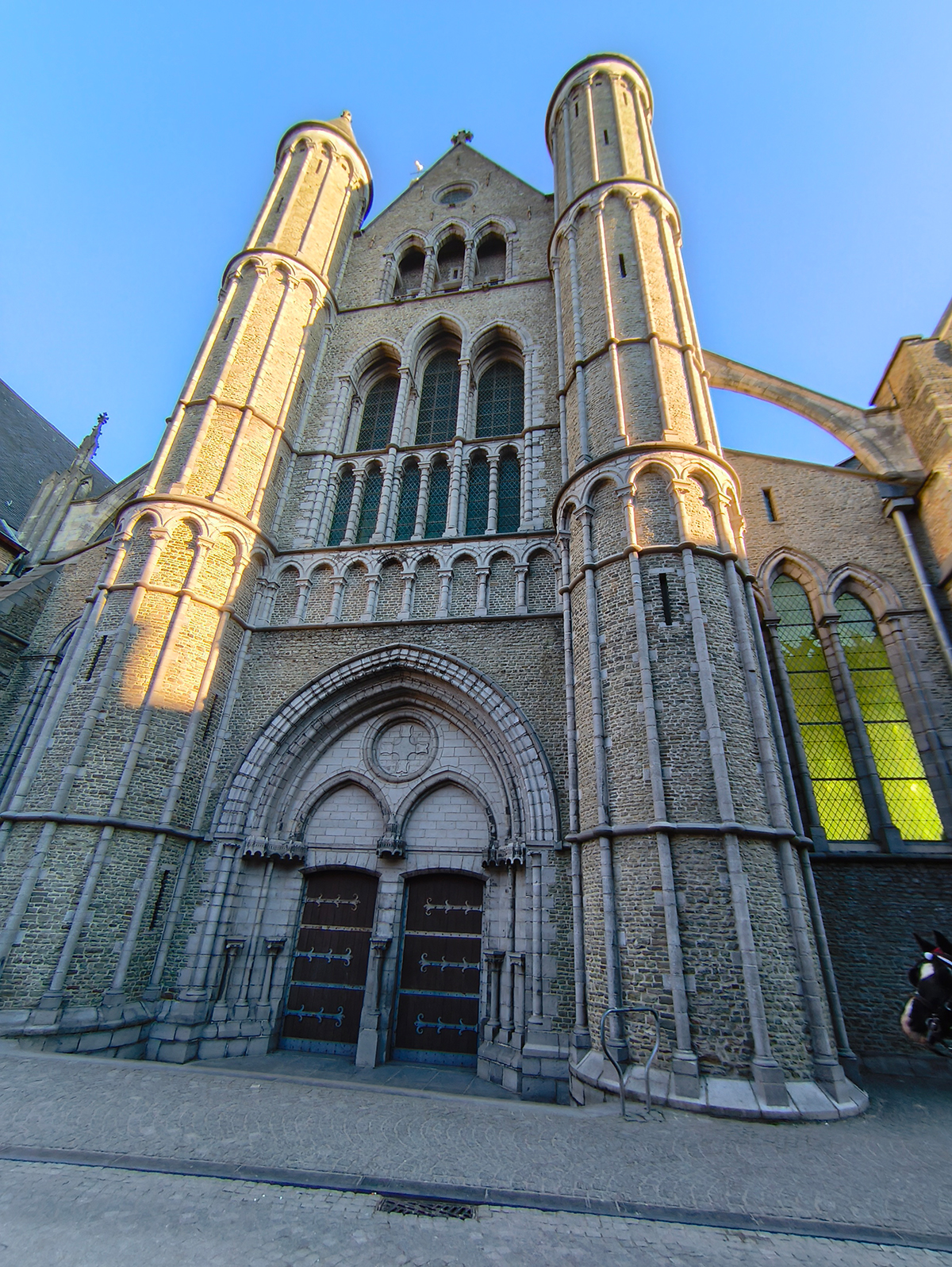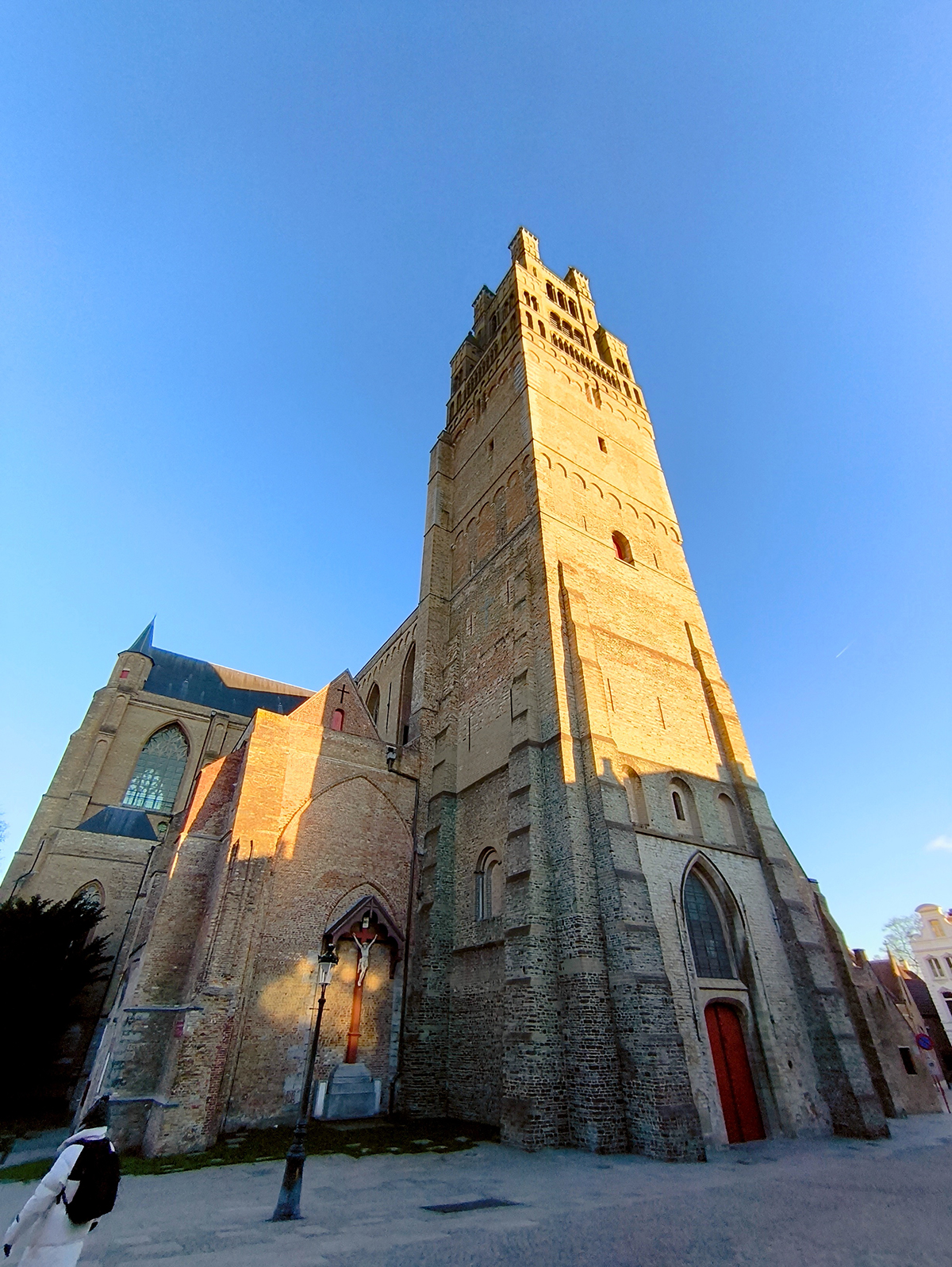 Continuamos nuestro paseo hasta la cercana catedral de San Salvador, Sint Salvatorskathedraal, la parroquia más antigua de Brujas, con partes de su estructura que datan de los siglos XII al XV. El edificio muestra una mezcla interesante de estilos debido a sus largos períodos de construcción y restauraciones. La poderosa torre de unos 99 m es la parte más antigua y combina elementos románicos y góticos. No pudimos acceder a su bello interior por estar cerrada.