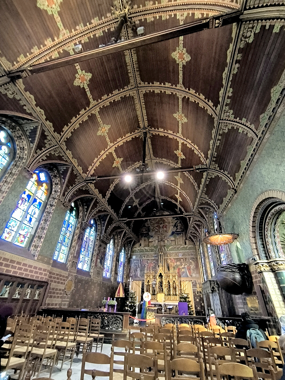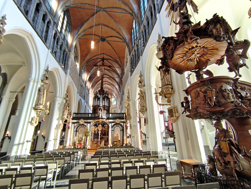 Su interior es vasto y monumental, dividido por un doksaal, un tipo de mampara o coro. En el interior de esta iglesia predomina el blanco y lo luminoso. El techo es una red de arcos góticos que parecen flotar a gran altura y siguiendo la tradición de Flandes, muchos de los muros de ladrillo están cubiertos con cal, lo que acentúa la sensación de espacio y limpieza visual. En algunas secciones, se ha dejado el ladrillo original al descubierto, recordándote que estás en el corazón del Gótico Costero.