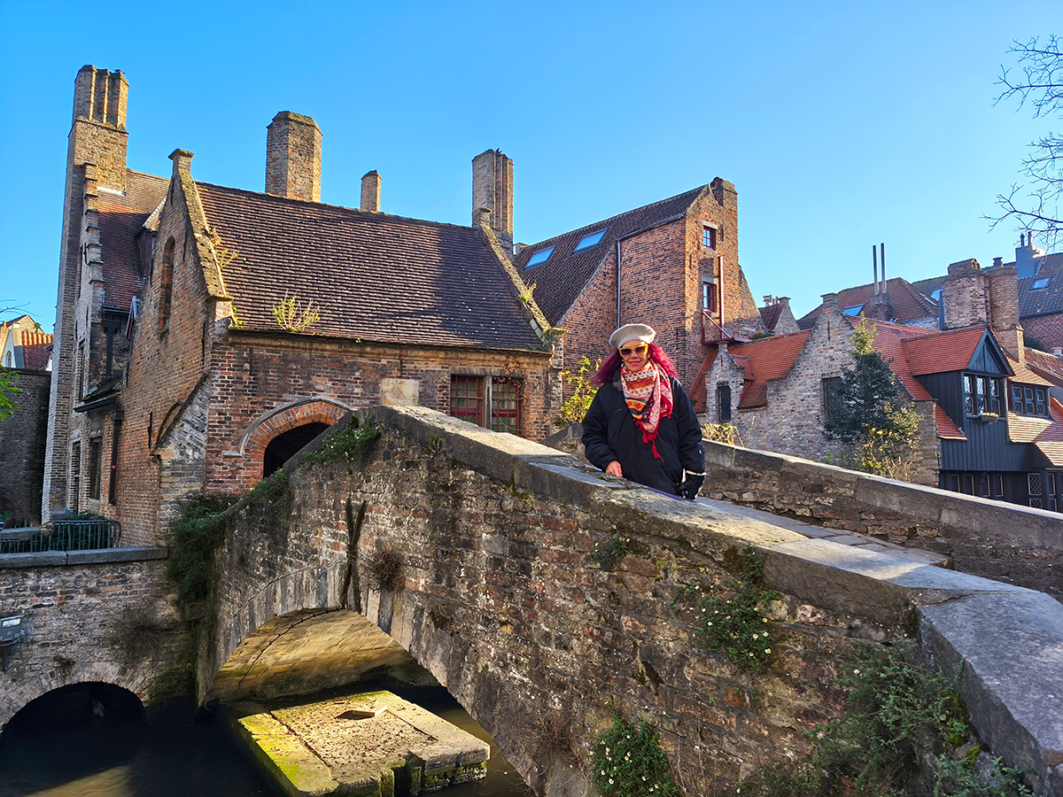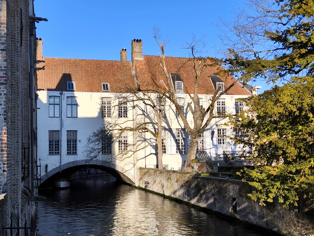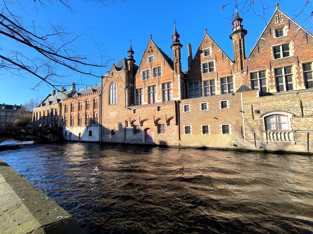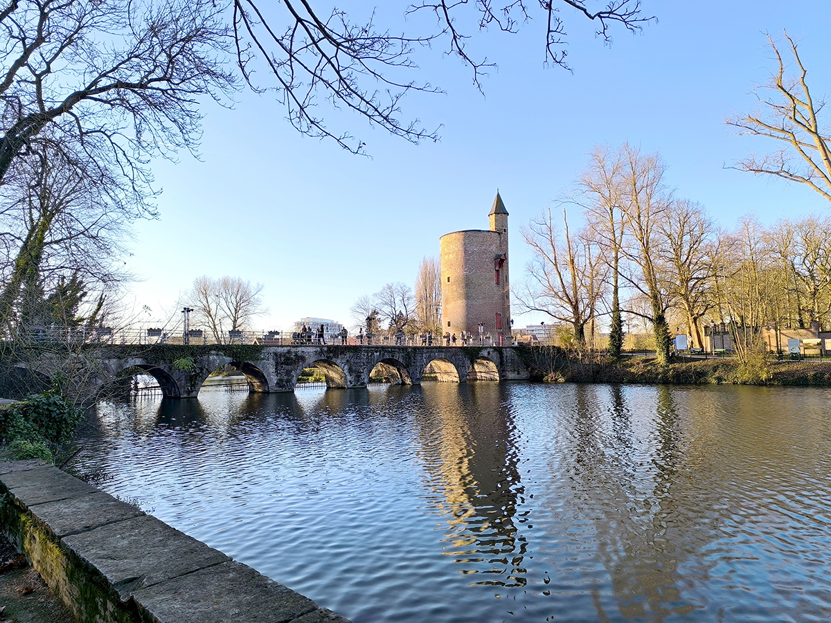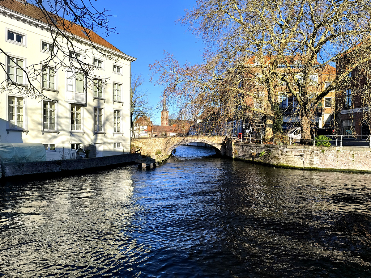 En este punto donde se cruza el Canal Dijver, es el lugar donde se obtiene una de las perspectivas más famosas de la ciudad y donde puedes ver tres pilares de la historia de Brujas en un solo vistazo: la Iglesia de Nuestra Señora o Onze-Lieve-Vrouwekerk con su torre de ladrillo de 115 m., el Hospital de San Juan o Sint-Janshospitaal, el antiguo sanatorio medieval, uno de los más antiguos de Europa que data del s. XII y el Canal con sus botes deslizándose suavemente por sus aguas.