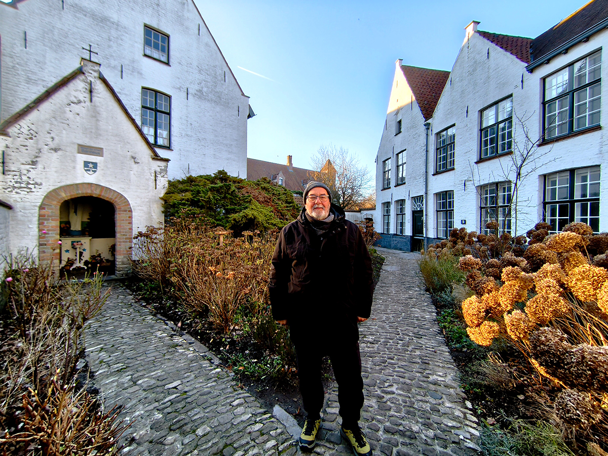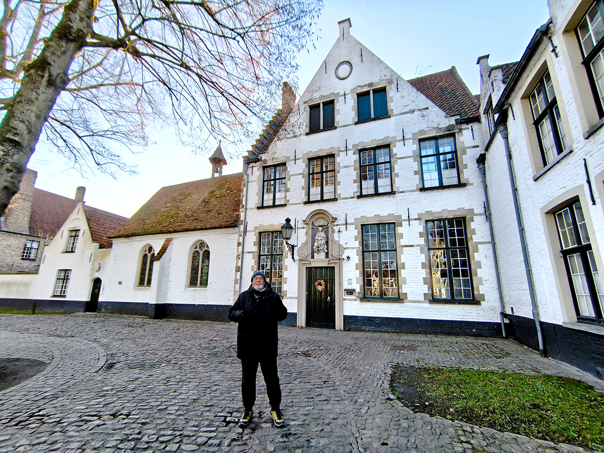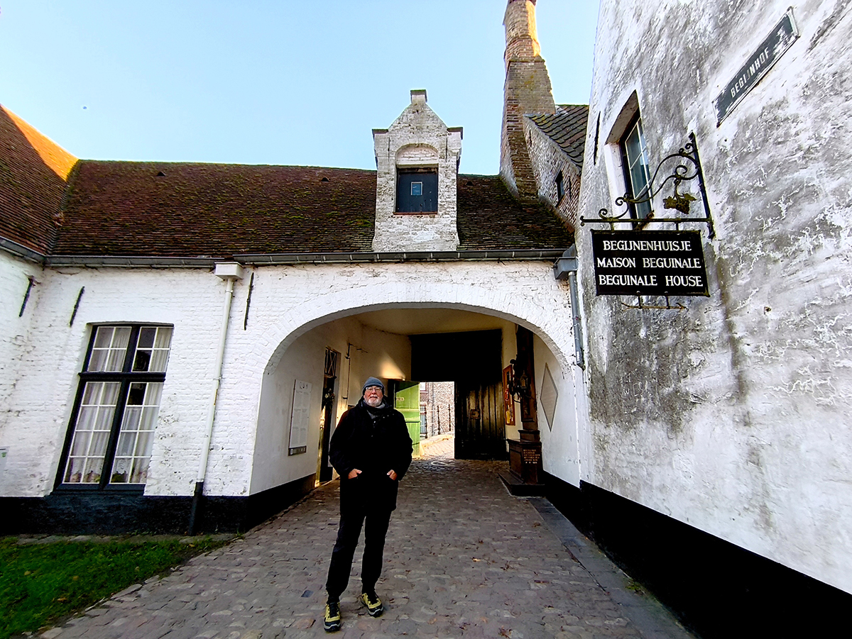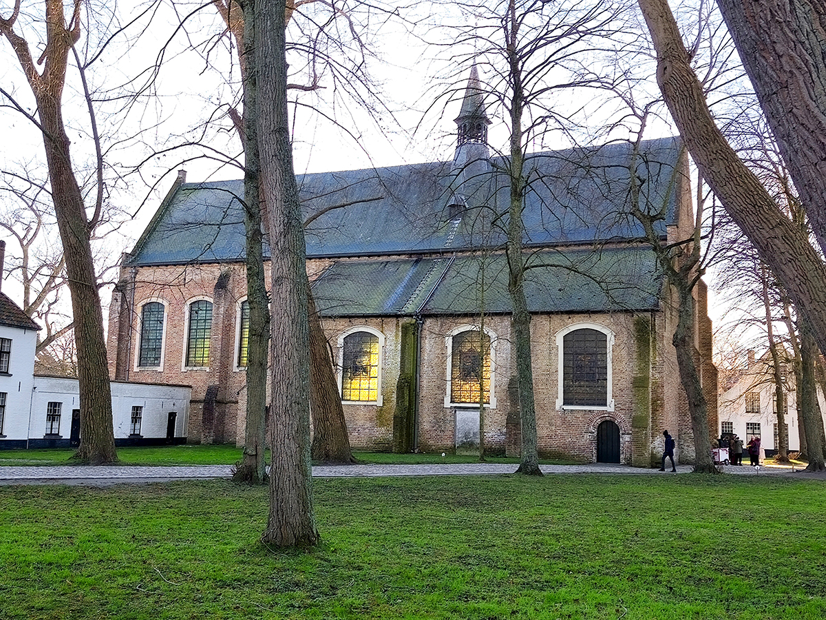 Este beaterio fue fundado en el año 1245 por Margarita de Constantinopla, condesa de Flandes. Hoy en día, las casas están habitadas por monjas de la Orden de San Benito y mujeres de Brujas que no pertenecen a ninguna orden religiosa. Es un patio rectangular grande y sereno, cubierto de hierba y árboles. Está rodeado por cerca de 30 casitas de fachada blanca, típicas de Flandes, que contrastan con las fachadas de ladrillo del resto de Brujas. Hay una pequeña iglesia gótica dedicada a Santa Isabel de Hungría y una casa que funciona como museo, la cual recrea el estilo de vida de las beguinas en el siglo XVII. El acceso al patio del Beaterio y a sus jardines es gratuito.