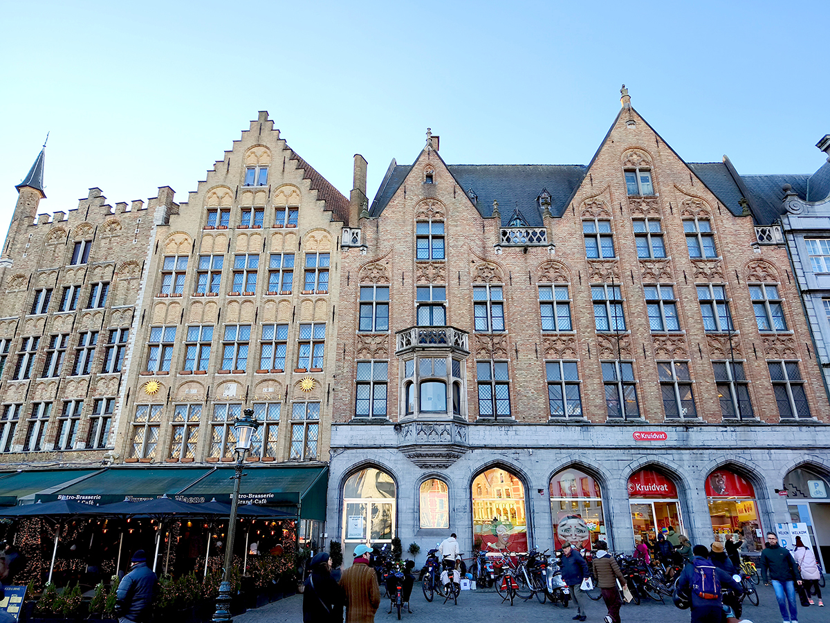 Alrededor de la plaza encontramos algunos de los edificios más emblemáticos de la zona. El Poortersloge o Lonja de los Burgueses. Un hermoso edificio de estilo gótico tardío que servía como punto de encuentro para la élite comercial de la ciudad. En cuya fachada podemos encontrar el famoso oso de Brujas. Justo enfrente vemos el Tollhuis o Antigua Casa de Aduanas, donde se cobraban los peajes y las tasas por las mercancías que entraban en el puerto.