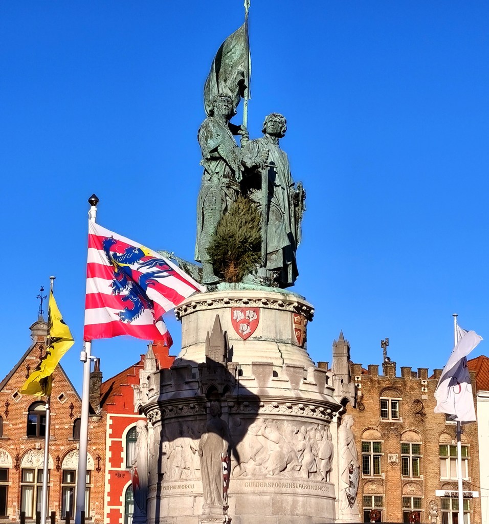En el centro de la plaza se encuentra un gran monumento erigido en honor a Jan Breydel y Pieter de Coninck. Estos dos héroes lideraron la revuelta flamenca contra las tropas francesas del rey Felipe IV a principios del siglo XIV, culminando en la famosa Batalla de las Espuelas Doradas del año 1302. La estatua simboliza el orgullo y la lucha de Flandes por su libertad.