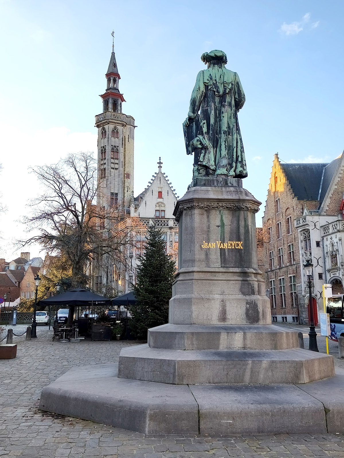 La plaza está situada al norte de las plazas principales, la Grote Markt y Burg, marcando el final de los canales Spiegelrei y Langerei. En el centro de la plaza se encuentra la estatua del pintor Jan van Eyck, erigida en el año 1878.