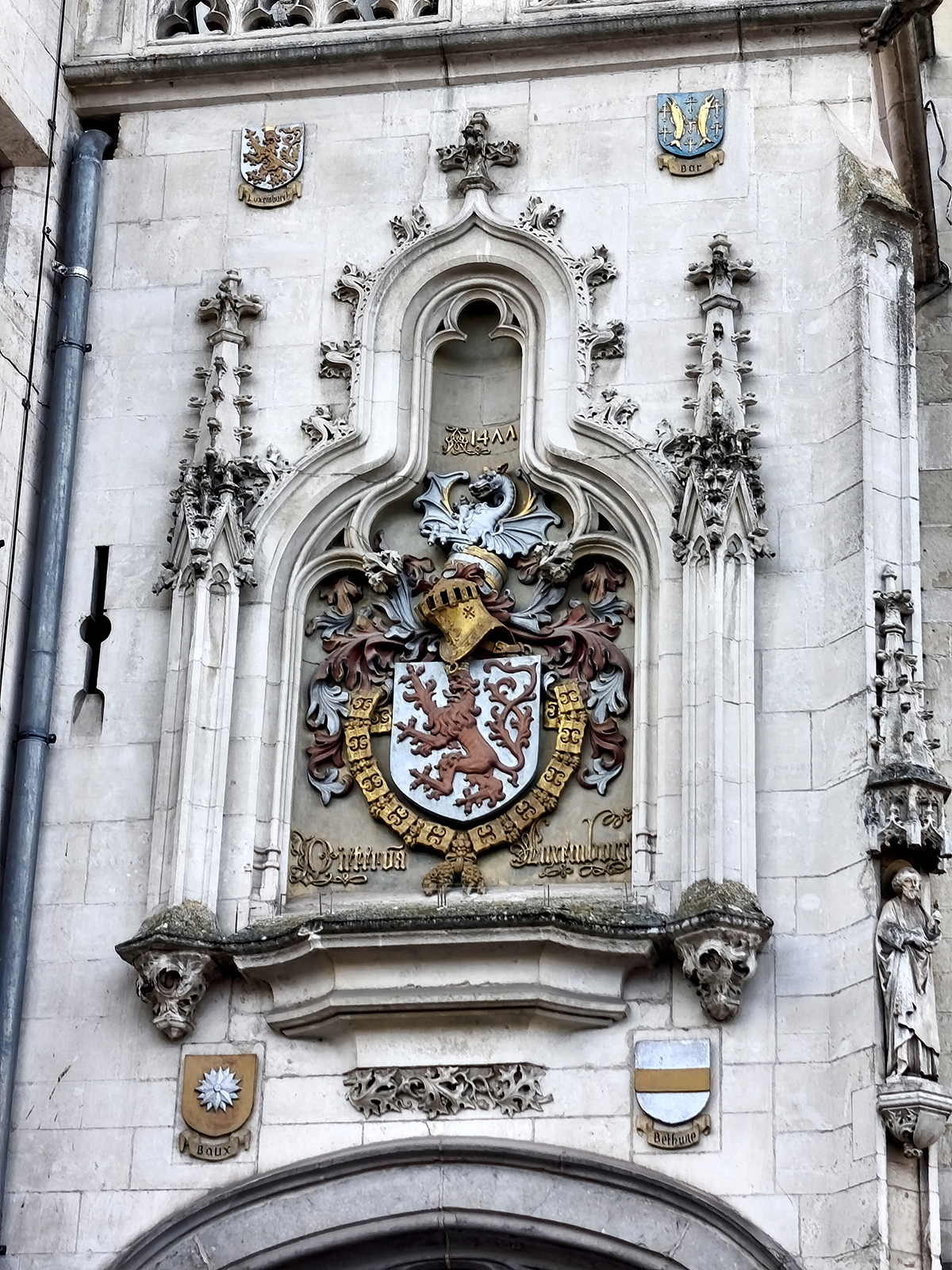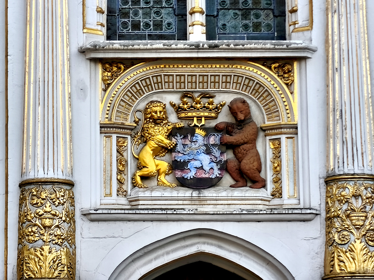 Antes de entrar en la Gran Plaza Burg, si vienes del paseo anterior, pasarás por este pequeño callejón empedrado que termina en una estrecha puerta con un arco de estilo renacentista decorado con figuras doradas. La leyenda cuenta que cuando los habitantes de Gante robaron el dragón dorado de la catedral de Brujas que hoy corona el campanario de Gante, intentaron llevárselo en un carro tirado por un asno. El animal se negó a moverse hasta que le taparon los ojos, logrando así sacar el botín de la ciudad por este callejón. Tal vez algo menos prosaico sea que en el s. XV existía aquí un albergue llamado Den Blinden Ezel, el Asno Ciego, que probablemente dio nombre a la calle.